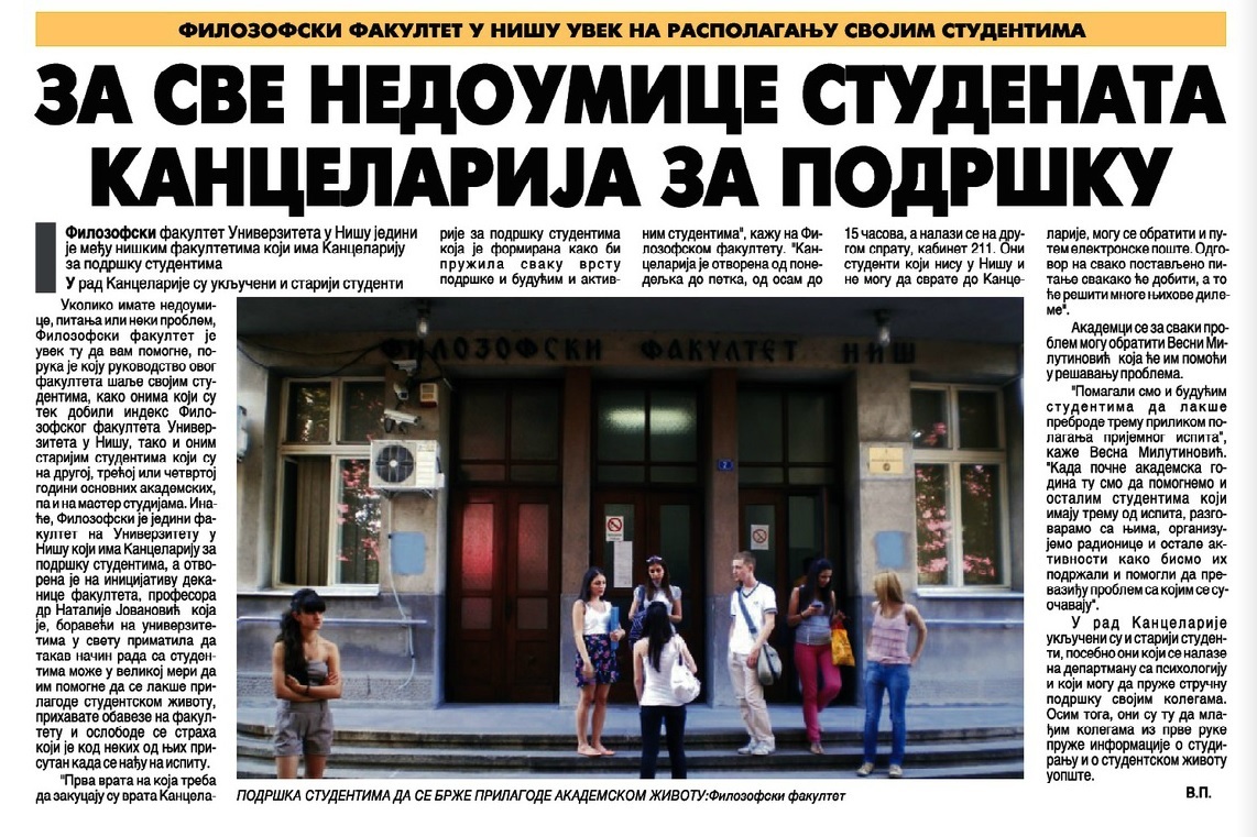 Уколико имате недоумица, питања или неки проблем, Филозофски факултет је увек ту да вам помогне, порука је коју руководство Факултета шаље својим студентима, како онима који су тек добили индекс, тако и оним старијим студентима који су на другој, трећој или четвртој години основних академских, па и на мастер студијама. Иначе, Филозофски факултет у Нишу једини је међу нишким факултетима који има канцеларију за подршку студентима, а отворена је на иницијативу деканице Факултета, проф. др Наталије Јовановић, која је, боравећи на универзитетима у свету, приметила да такаав начин рада са студентима може у великој мери да им помогне да се лакше прилагоде студентском животу, прихвате обавезе на факултету и ослободе од страха који је код неких од њих присутан када се нађу на испиту.