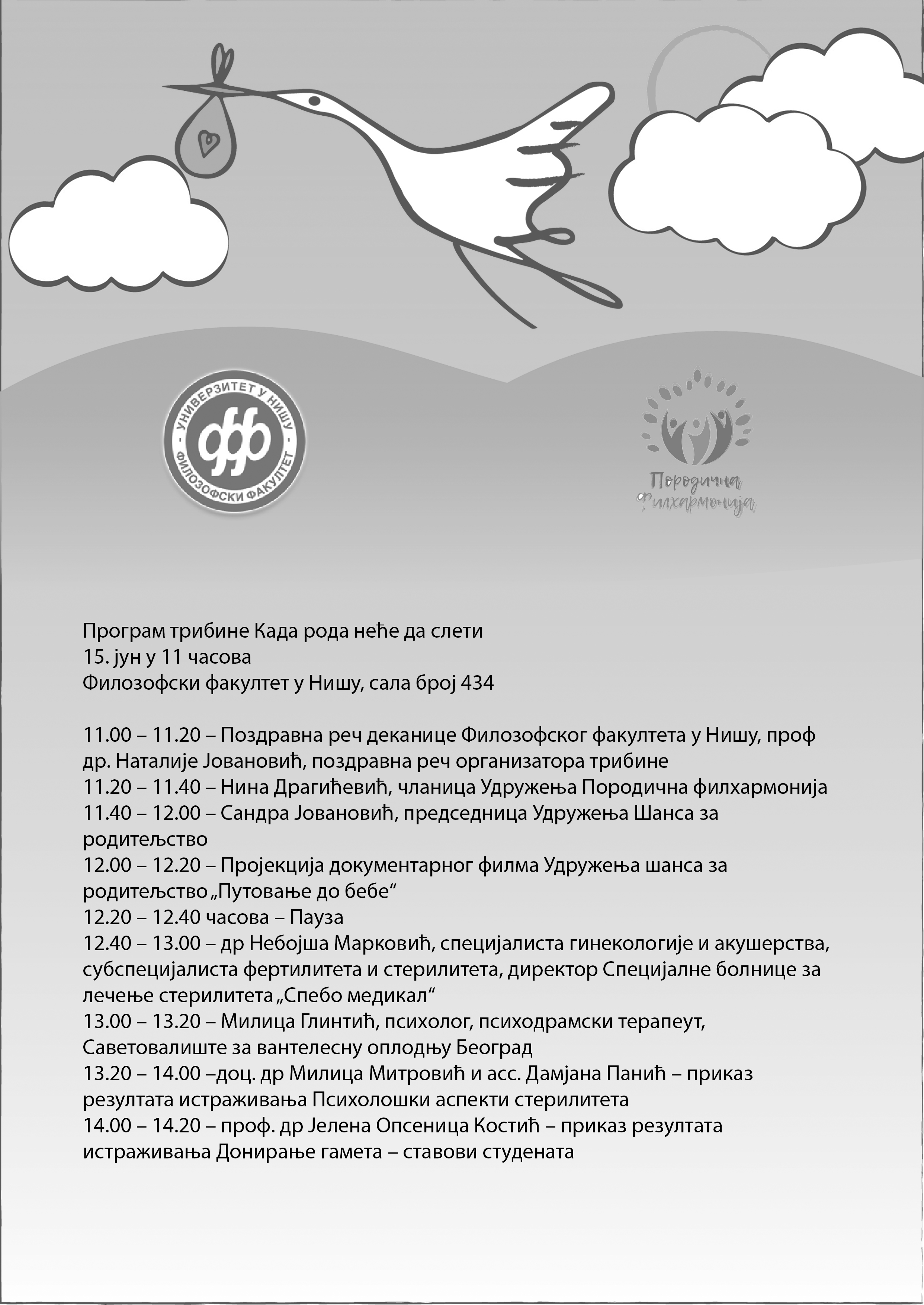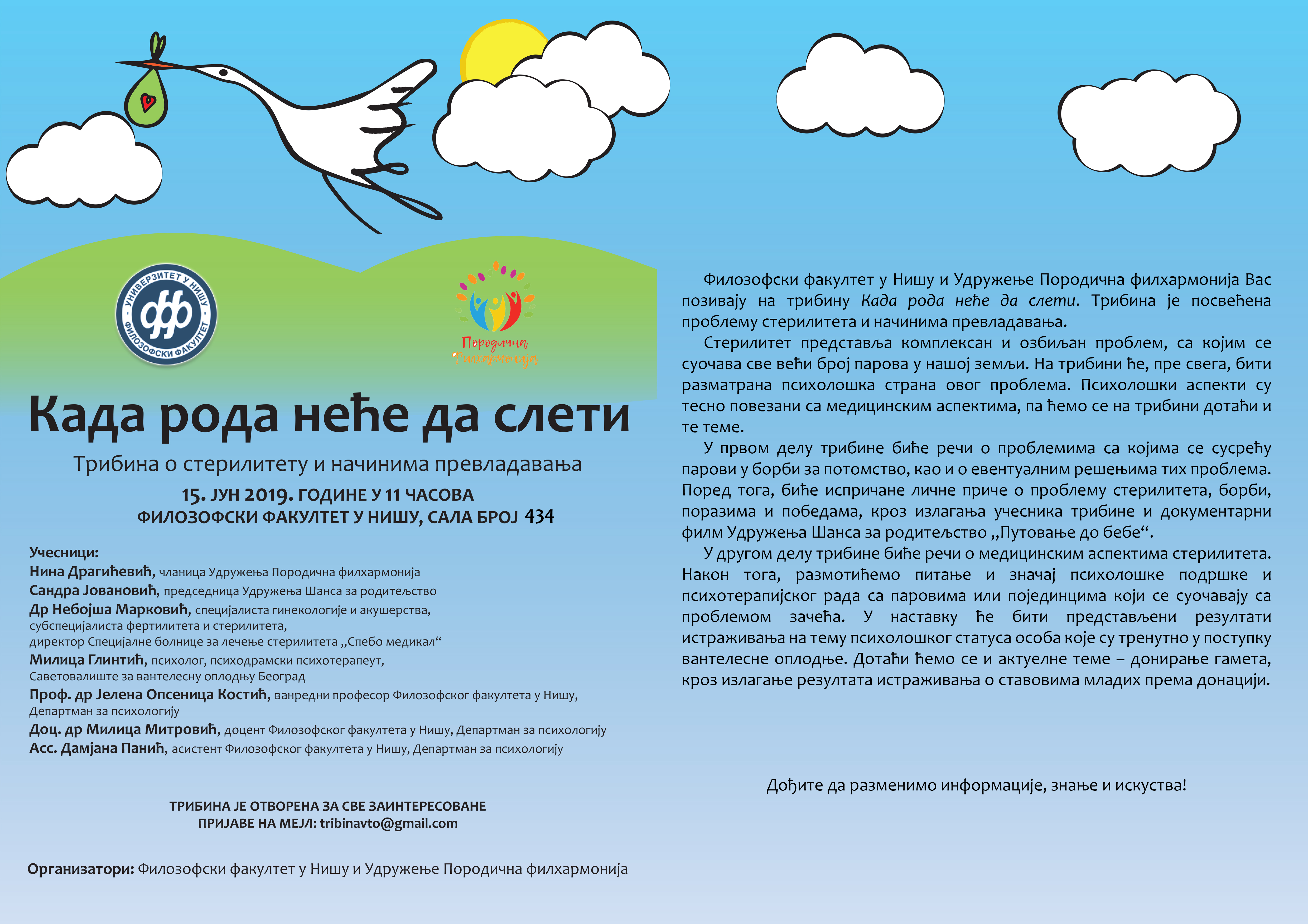 Филозофски факултет у Нишу и Удружење Породична филхармонија Вас позивају на трибину Када рода неће да слети. Трибина је посвећена проблему стерилитета и начинима превладавања.