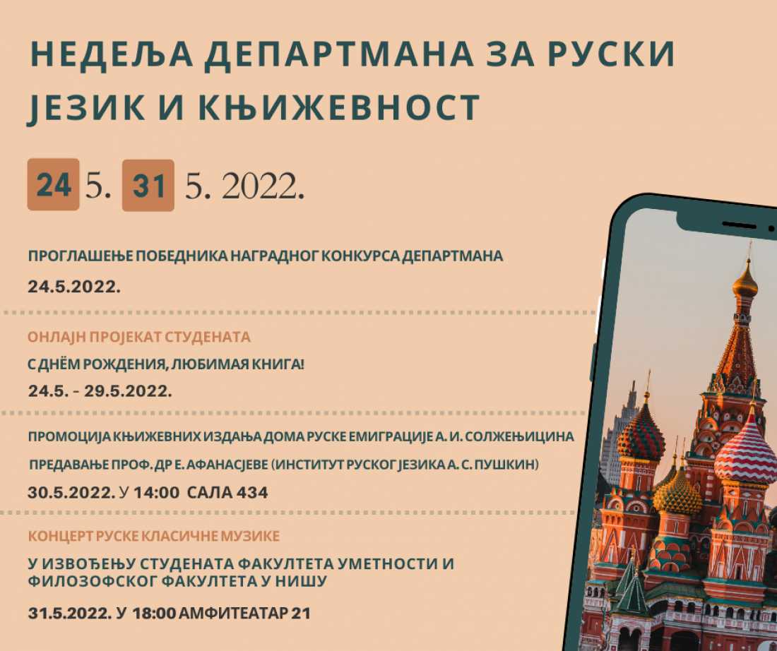 Департман за руски језик и књижевност Филозофског факултета Универзитета у Нишу обележава Недељу Департмана разноврсним активностима, које ће бити реализоване онлајн и уживо, у просторијама факултета. Упућујемо позив свим наставницима и професорима руског језика, садашњим и будућим студентима, као и свим љубитељима руског језика, уметности и културе:
