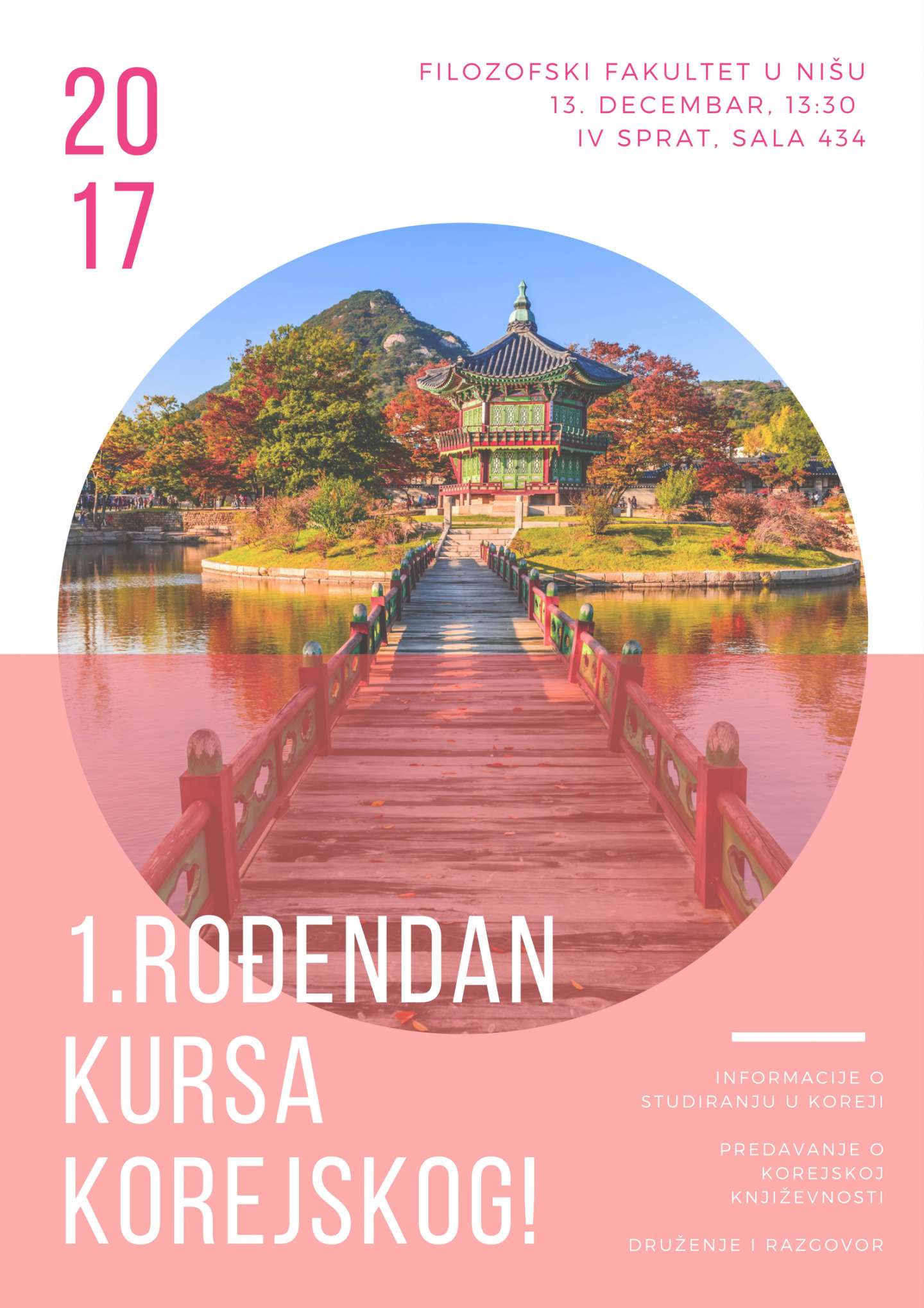 Поводом обележавања прве године факултативног курса корејског језика на нашем факултету, 13. децембра 2017. од 13.30 до 15.30. часова у учионици 434, IV спрат, организује се пригодна свечаност, са следећим садржајем: