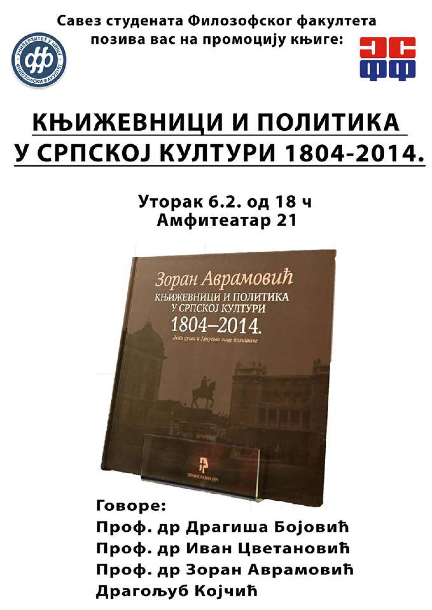 Савез студената Филозофског факултета у Нишу у уторак, 6.3.2018. године, у 18 сати у амфитеатру 21 организује промоцију књиге "Књижевници и политика у српској култури 1804-2014."
