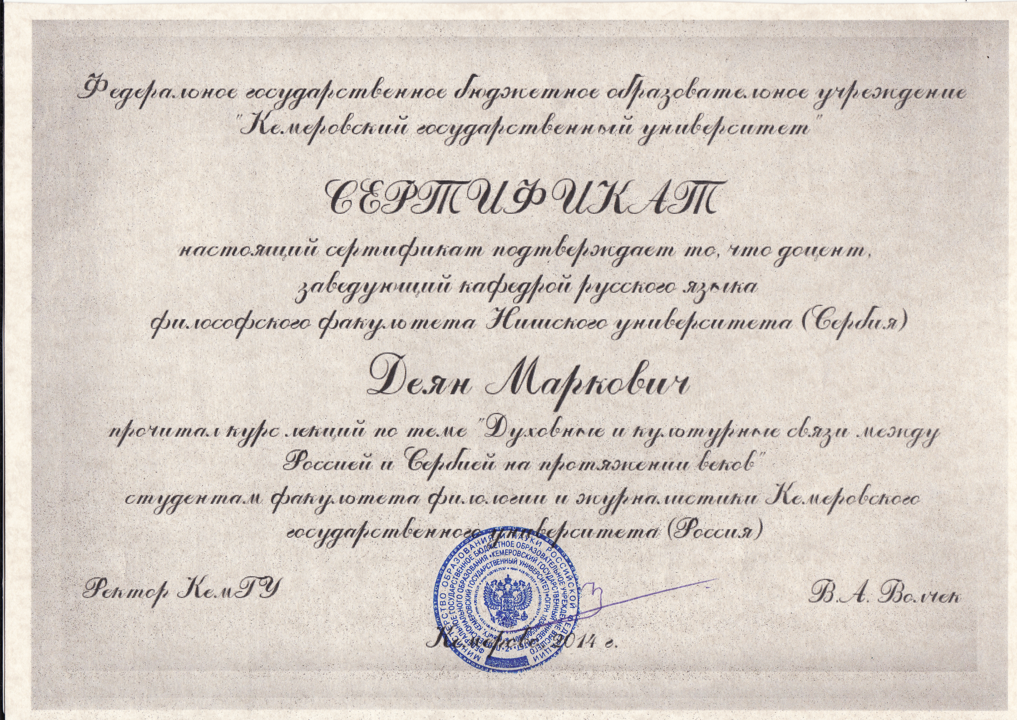 Предавања по позиву држао је у Руској Федерацији, у Кемерову (Кемеровски државни Универзитет) и у Белгороду (Белгородски државни Универзитет, БелГу).
