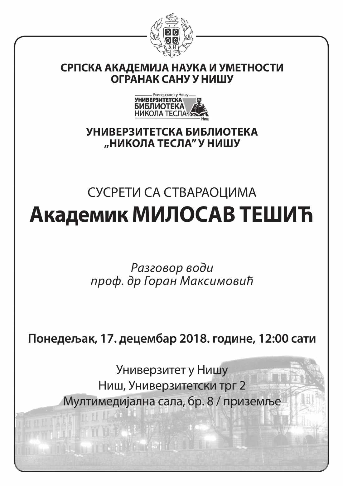У оквиру програма СУСРЕТИ СА СТВАРАОЦИМА Огранак САНУ у Нишу организује сусрет са академиком Милосавом Тешићем, песником и лексикографом, у понедељак, 17. децембра 2018. године, у 12:00 сати (Универзитет у Нишу, Мултимедијална сала, број 8).