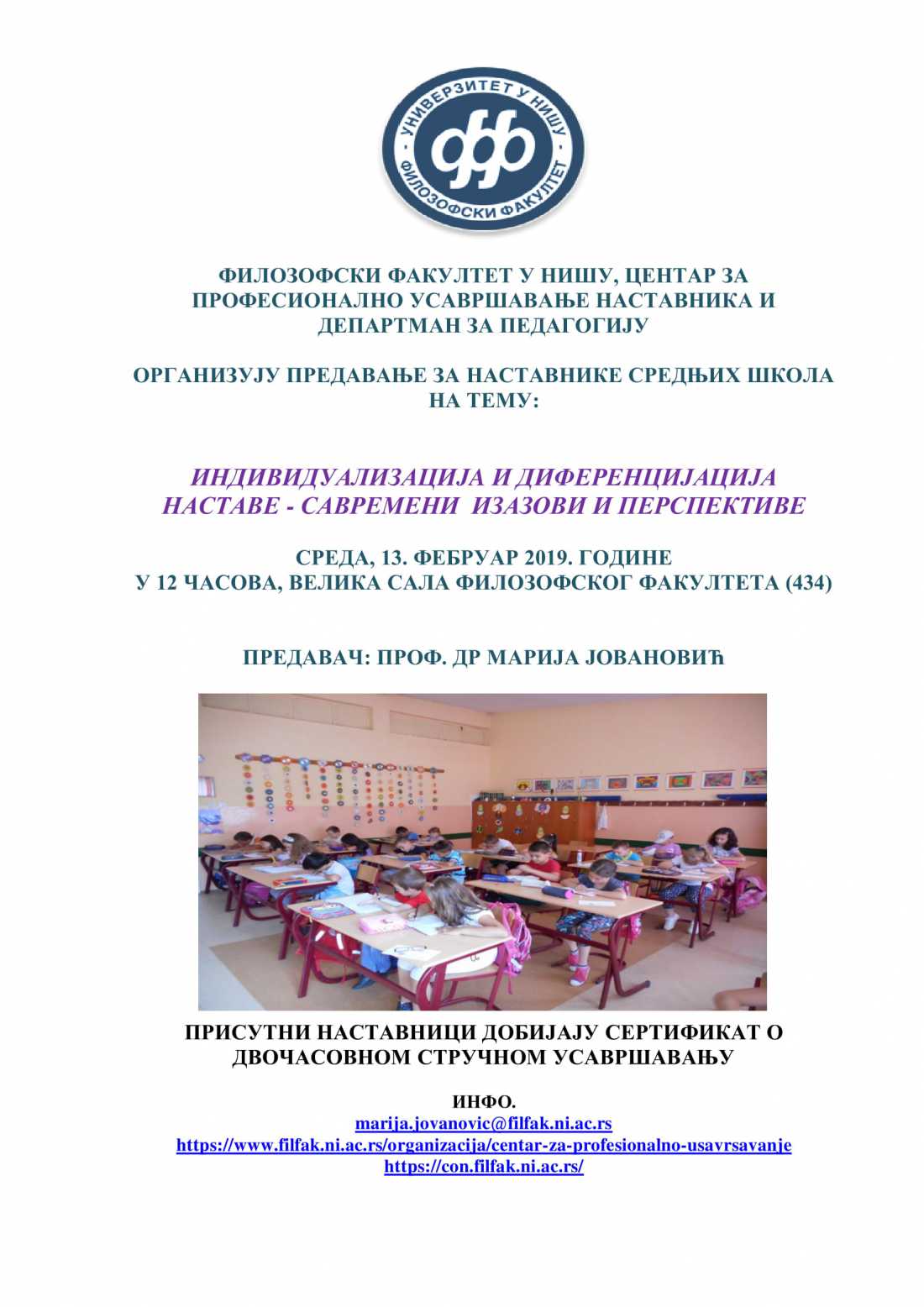 Филозофски факултет у Нишу и Центар за професионално усавршавање 13. фебруара 2019. организују предавање на тему "Индивидуализација и диференцијација наставе - савремени изазови и перспективе".