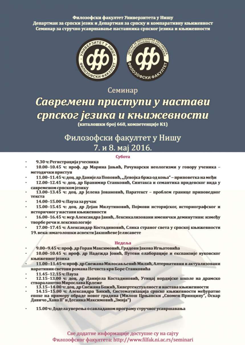 7. и 8. маја на Филозофском факултету у Нишу биће одржан семинар "Савремени приступи у настави српског језика и књижевности" (кат.број 668, компетенције К1). Све додатне информације доступне су на сајту Центра за образовање наставника и професионално усавршавање Филозофског факултета у Нишу, https://sites.google.com/site/nastavnickicentar