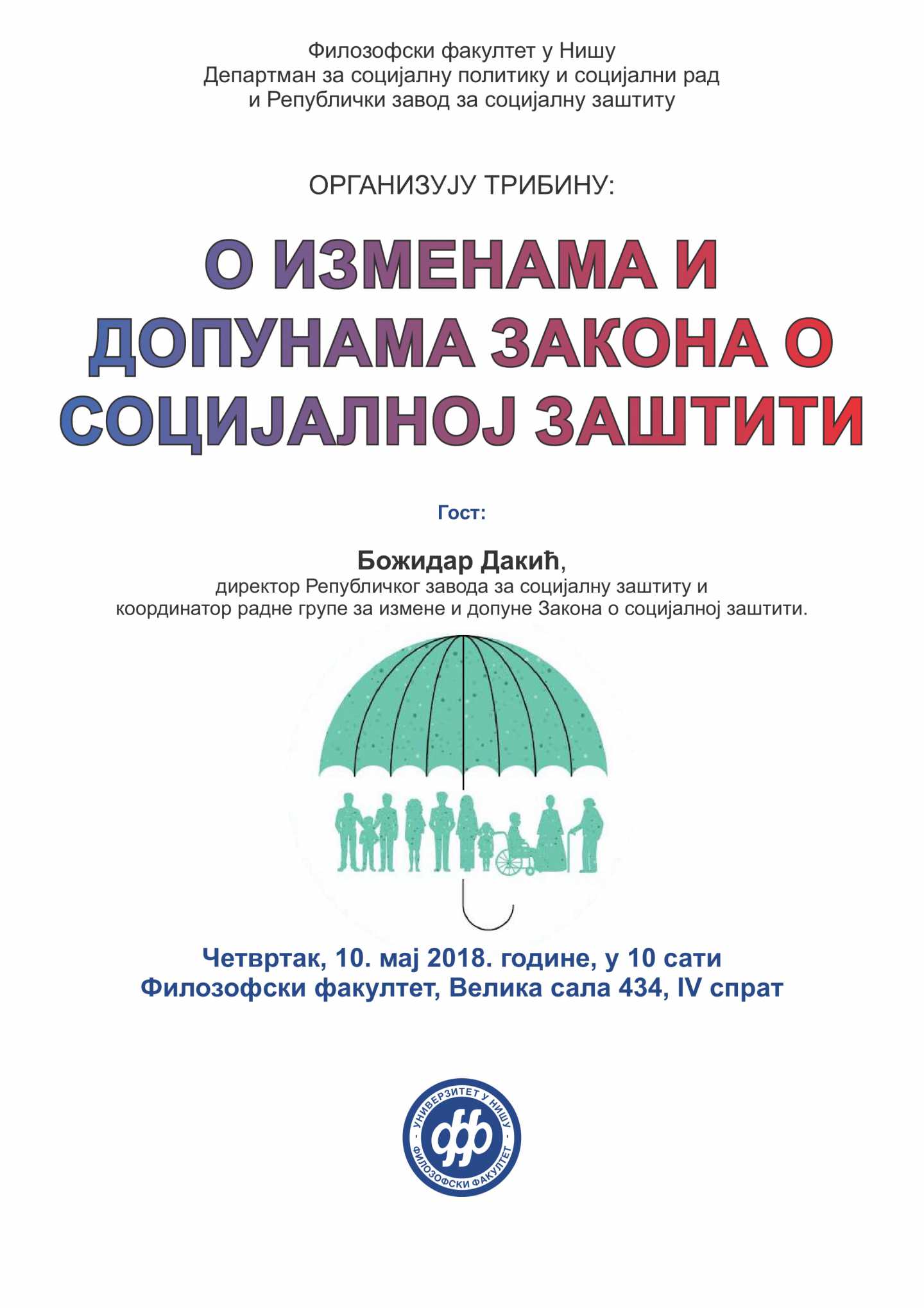 Департман за социјалну политику и социјални рад Филозофског факултета у Нишу и Републички завод за социјалну заштиту организовали су 10. маја 2018. године трибину о изменама и допунама Закона о социјалној заштити. Гост трибине био је Божидар Дакић, директор Републичког завода за социјалну заштиту и координатор радне групе за измене и допуне Закона о социјалној заштити.