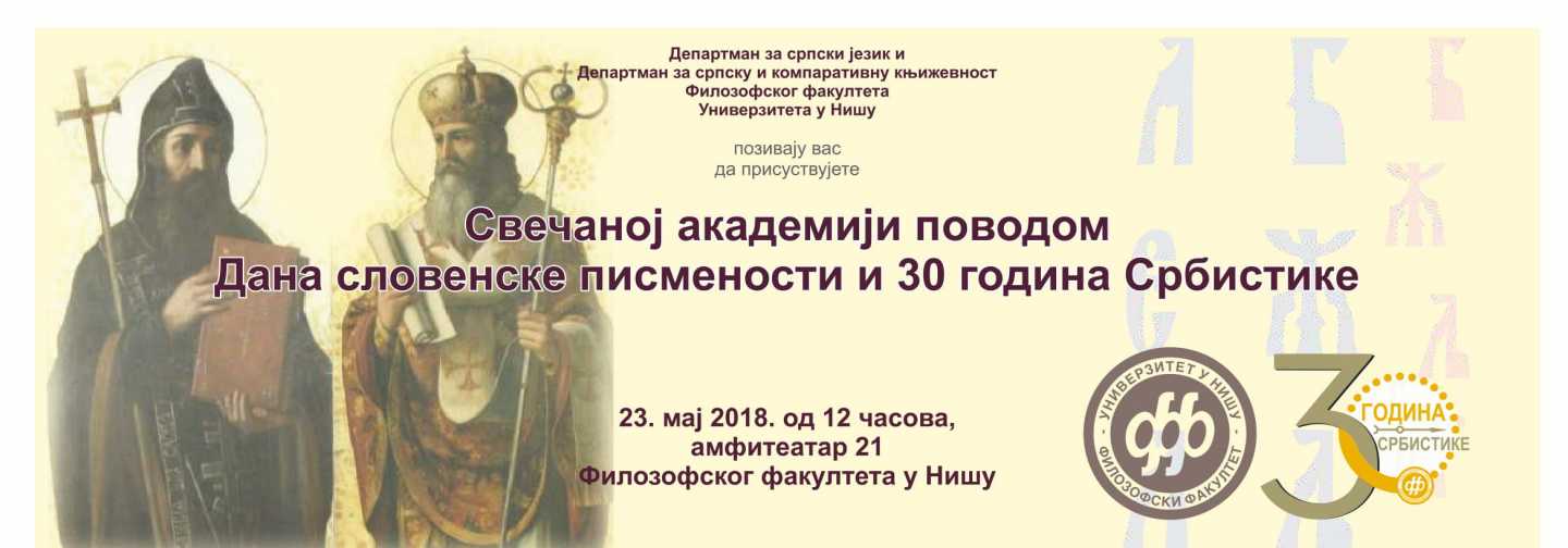 Поводом Дана словенске писмености, као и тридесет година србистике, на Филозофском факултету у Нишу одржаће се свечана Академија у среду, 23. 5. 2018. године са почетком у 12.00 у амфитеатру бр. 21.