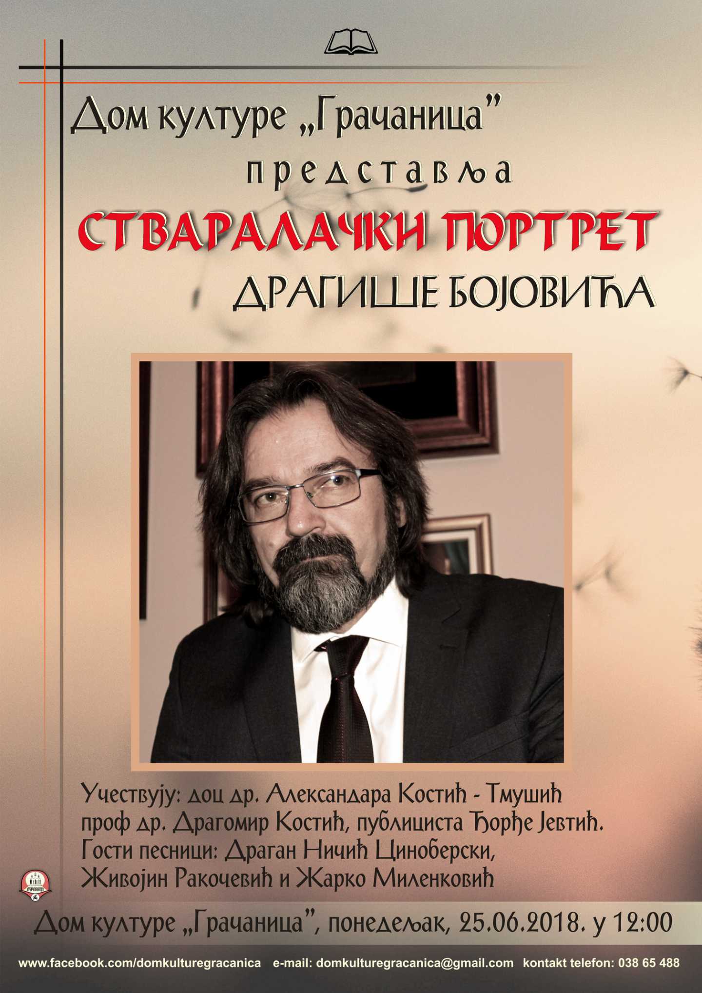 Проф. др Драгиша Бојовић је широка стваралачка појава, активни учесник јавног живота, један од најважнијих познавалаца старе српске књижевности, песник, професор, историчар књижевности, теолог, новинар и личност која је дубоко и динамично укључена у живот Косова и Метохије. Након изгона 1999. године покренуо је у Нишу замашне активности: професор је на Универзитату, управник Центра за византијско-словенске студије Универзитета у Нишу; оснивач Центра за црквене студије и Међународног центра за православне студије. Донедавно је био први председавајући Међународне научне мреже Pax Byzantino-Slava, која окупља тридесет институција из света. На позив Института за славистику Хумболтовог универзитета средином јуна држао је предавања „Почеци српске књижевности“ и „Стара српска књижевност и књижевна традиција“.