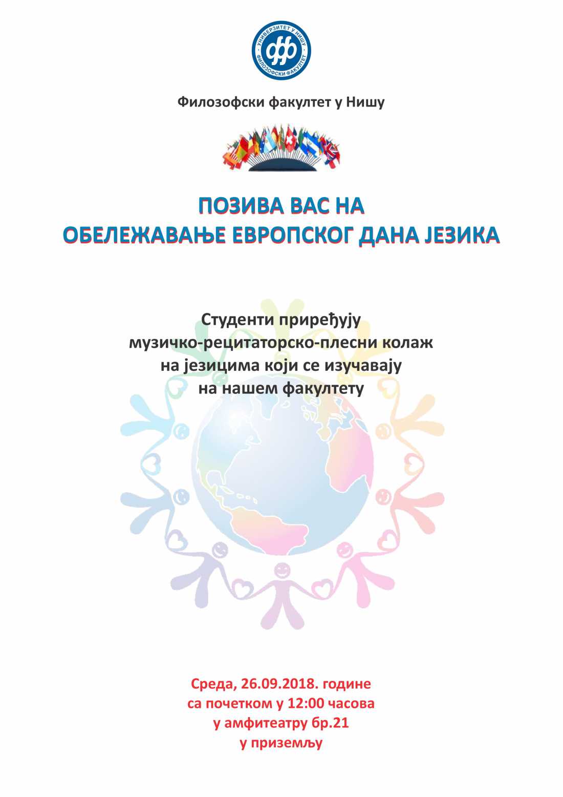 Филозофски факултет у Нишу позива вас на обележавање Европског дана језика 26. септембра у 12 сати у амфитеатру 21.