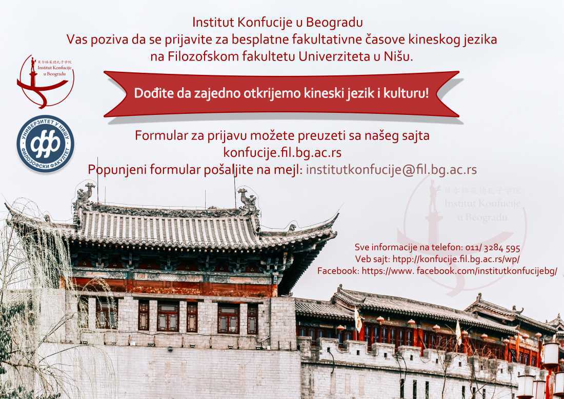 Обавештавамо вас да бесплатни курсеви кинеског језика, које организује институт Конфуције из Београда, почињу у четвртак, 11. октобра. Настава ће бити одржавана два пута недељно - четвртком и петком од 19:00 до 20:30 у слушаоници 19а.