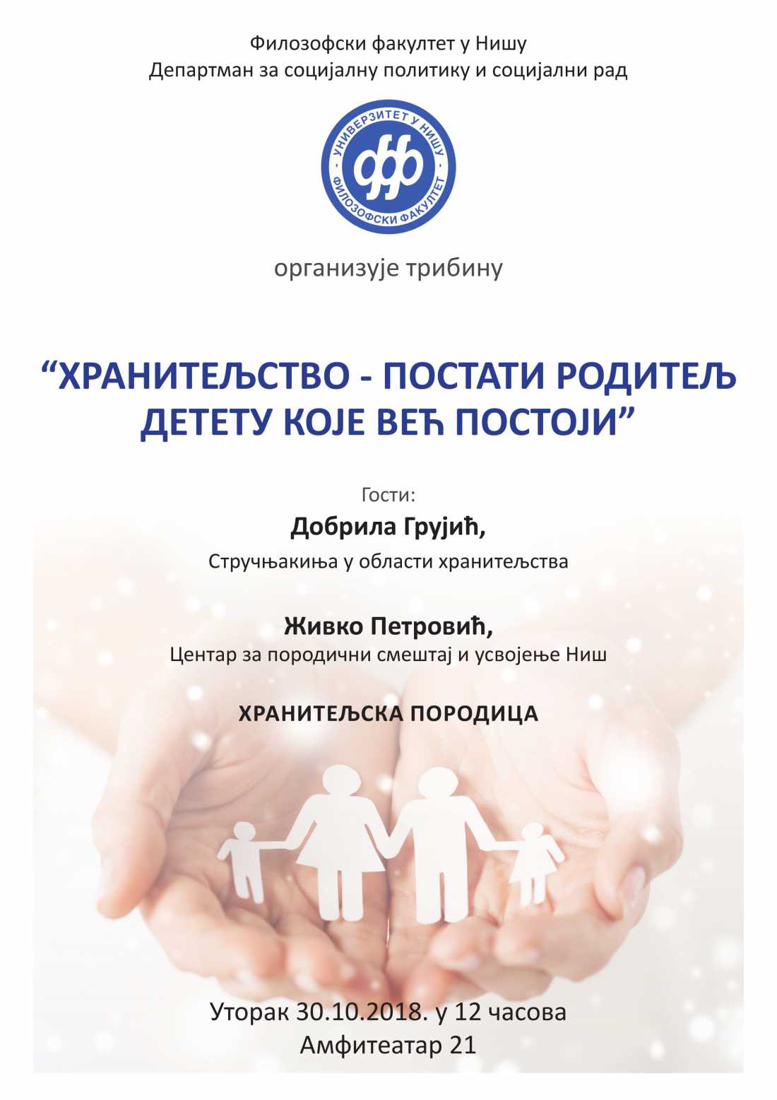 Департман за социјалну политику и социјални рад, у оквиру недеље Департмана, организује трибину ”Хранитељство - постати родитељ детету које већ постоји”.