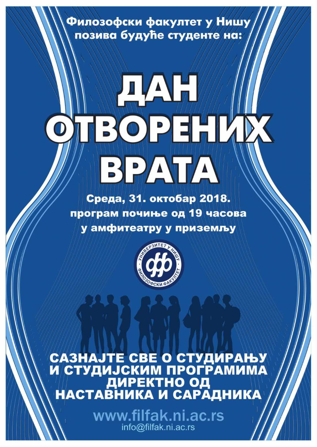 Позивамо вас на први Дан отворених врата Филозофског факултета у Нишу у овој школској години који ће бити организован у среду, 31. октобра, од 19 сати.