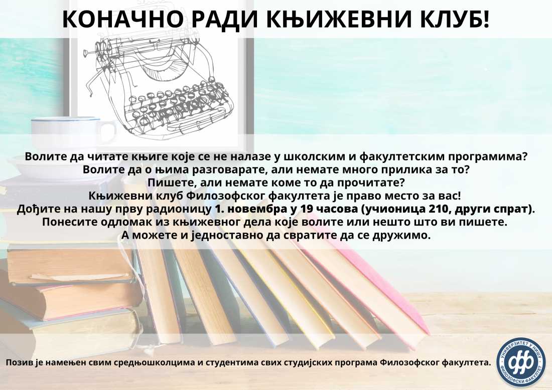 Коначно на нашем факултету почиње са радом Kњижевни клуб! За све средњошколце и студенте свих студијских програма нашег факултета који воле да читају и пишу, наставници и сарадници Департмана за српску и компаративну књижевност организоваће једном месечно једноипочасовне радионице креативног писања и читања.