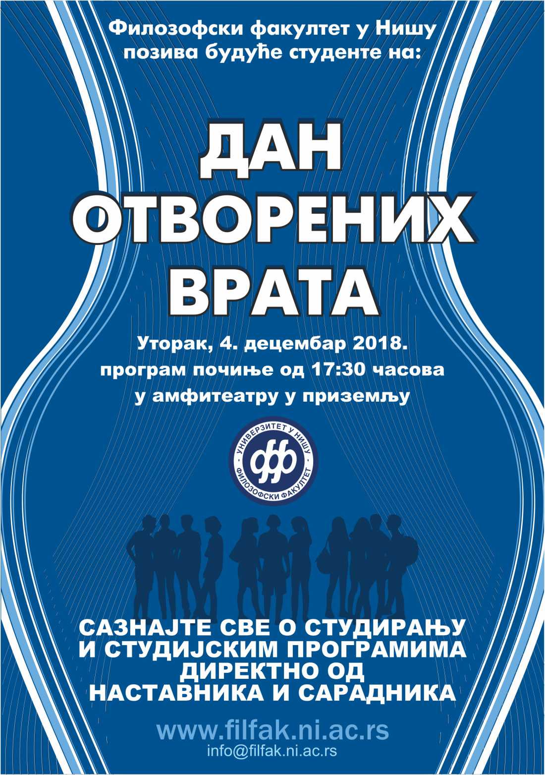 Због великог интересовања средњошколаца, Филозофски факултет организује још један Дан отворених врата у овом семестру оји ће бити одржан у уторак, 4. децембра у 17:30.