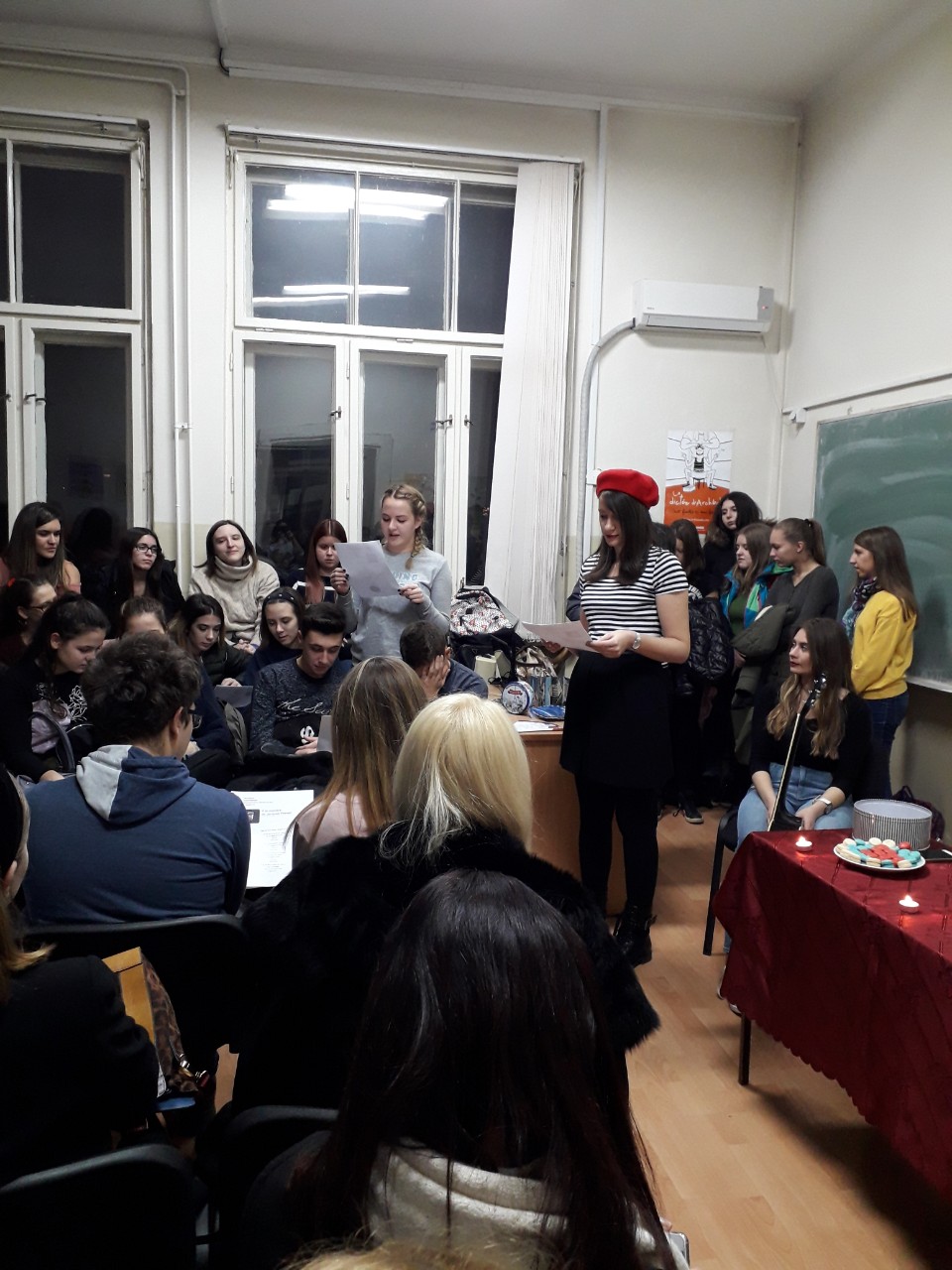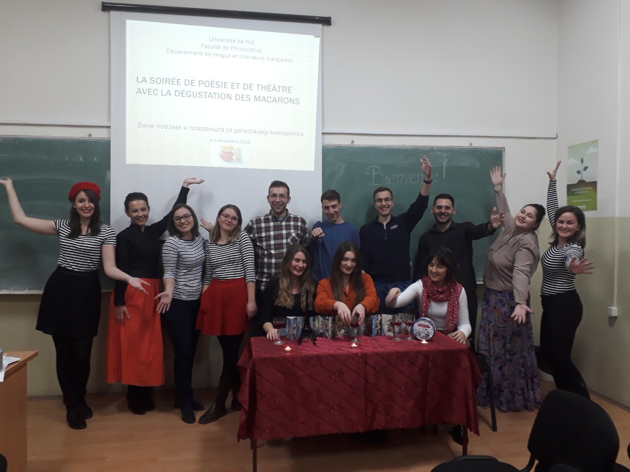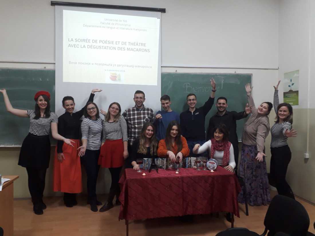У среду, 5. децембра сарадници и студенти Департмана за француски језик и књижевност приредили су Вече француске поезије и позоришта коме је присуствовало више од 60 ученика нишких средњих школа и гимназија. Учионица 204, која је била премала да прими све заинтересоване посетиоце, те вечери је претворена у париски кафе у коме су студенти Департмана казивали најлепше стихове Бодлера, Аполинера и Превера, док је други део сале преуређен у позоришну сцену на којој је изведен драматизовани одломак из Сремчевог романа Поп Ћира и поп Спира на француском језику.