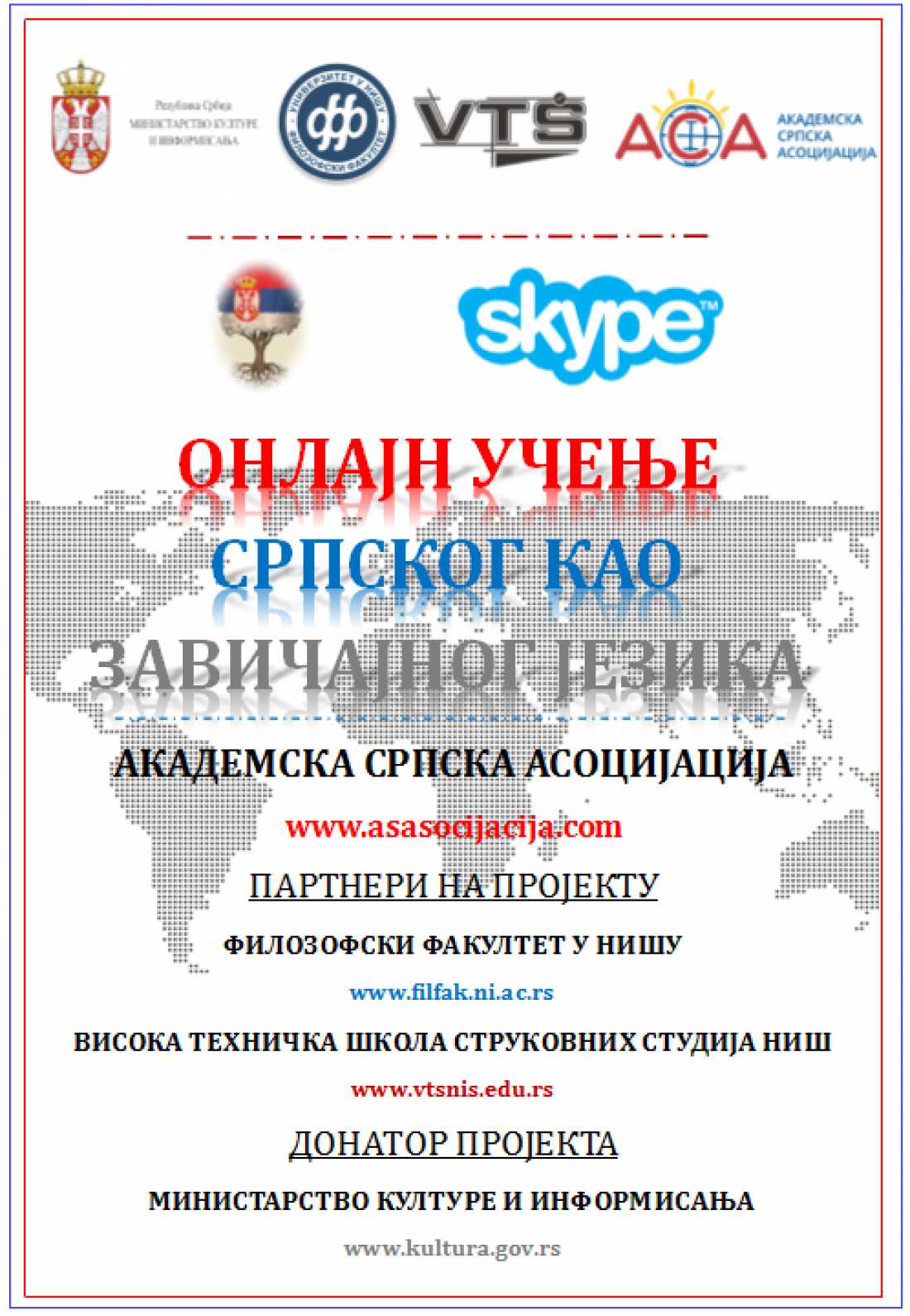 Најаве :: субота, 22.12.2018.Академска српска асоцијација и Филозофски факултет у Нишу најављују завршетак пројекта „Онлајн учење српског језика као завичајног“ и овом приликом позивају све заинтересоване на свечану манифестацију, која ће ће бити организована 25. децембра 2018, од 13 сати у великој сали Филозофског факултета у Нишу (434).