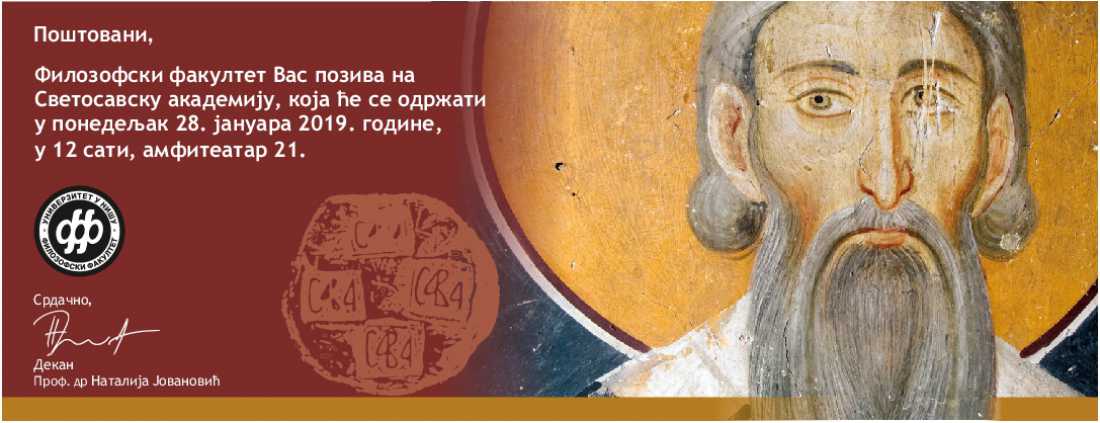 Обавештавамо све поштоваоце дела Светог Саве да ће се традиционална Светосавска академија одржати 28. 1. 2019. године у 12 сати у амфитеатру бр. 21.