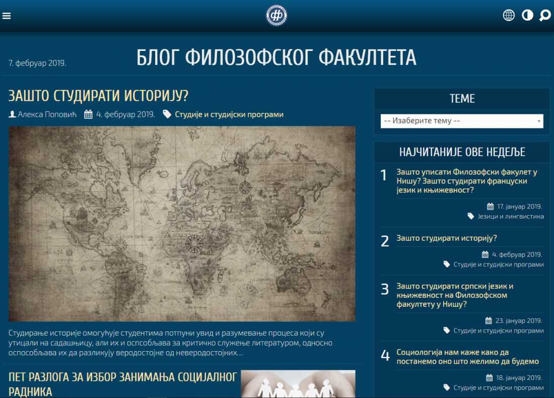 Факултетска дешавања :: четвртак, 07.02.2019.Велико нам је задовољство да вас обавестимо да је од данас у функцији и званични блог Филозофског факултета!