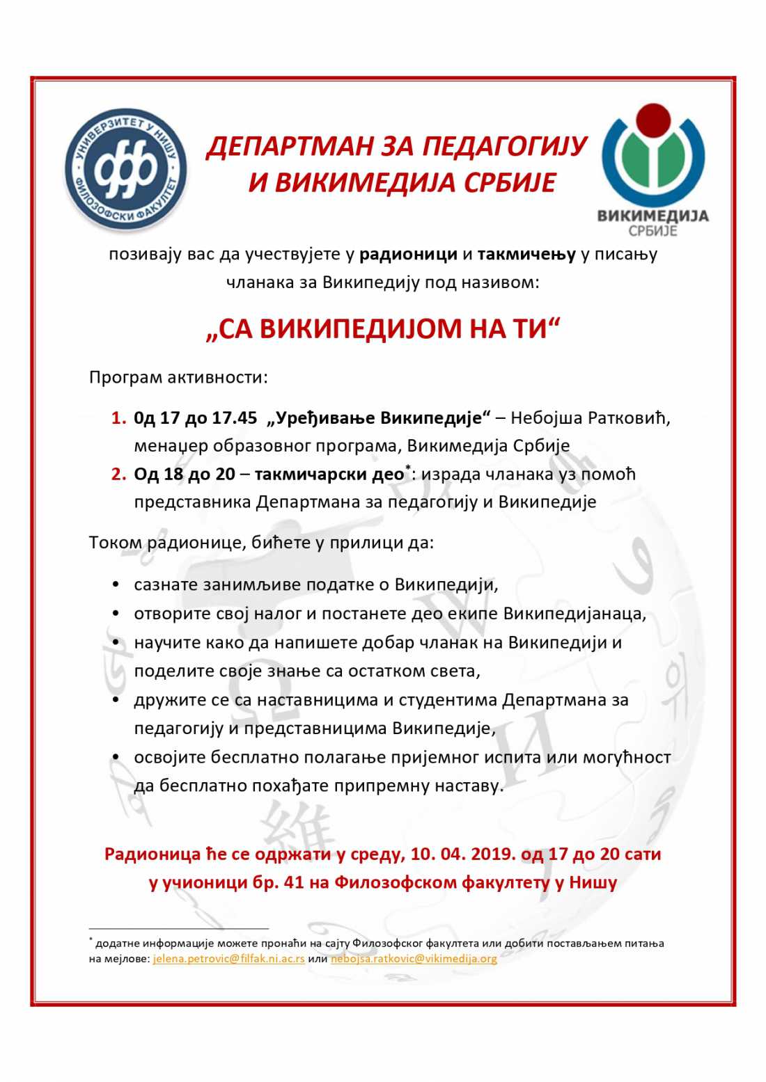 Департмна  за педагогију и Викимедија Србије позивају вас да учествујете у радионици и такмичењу у писању чланака за Википедију под називом: "Са Википедијом на ти".
