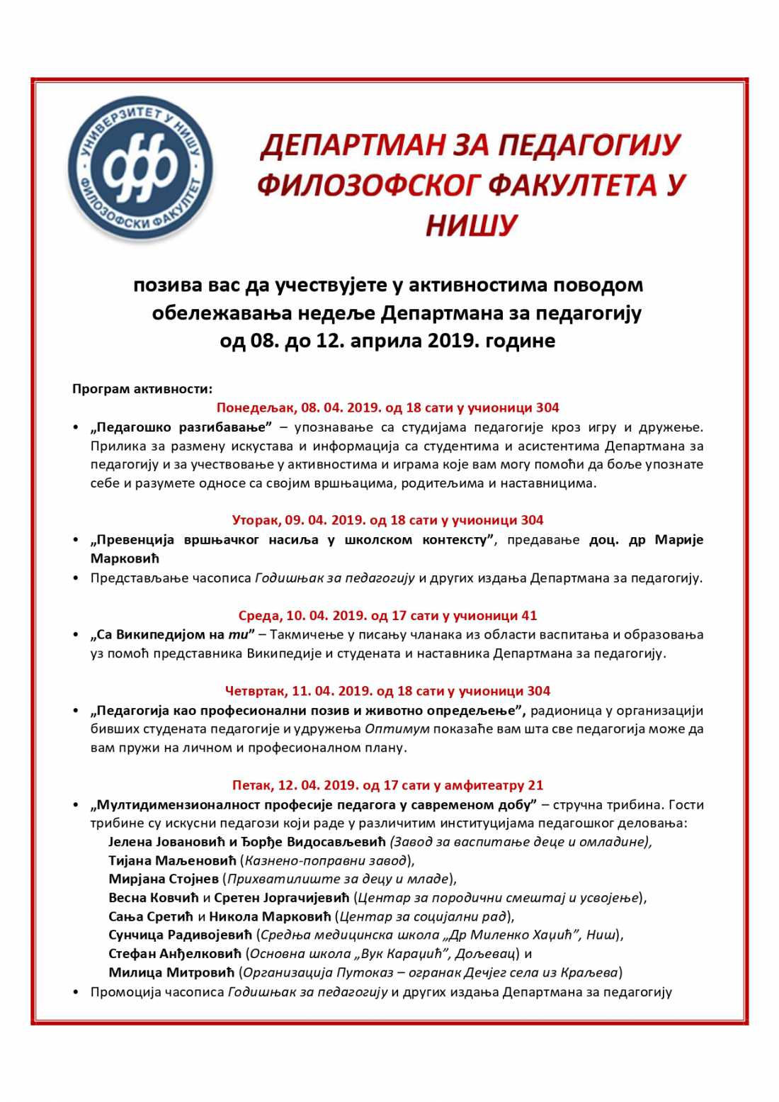 Департман за педагогију Филозофског факултета у Нишу позива вас да учествујете у активностима поводом обележавања Недеље Департмана за педагогију од 8. до 12. априла.
