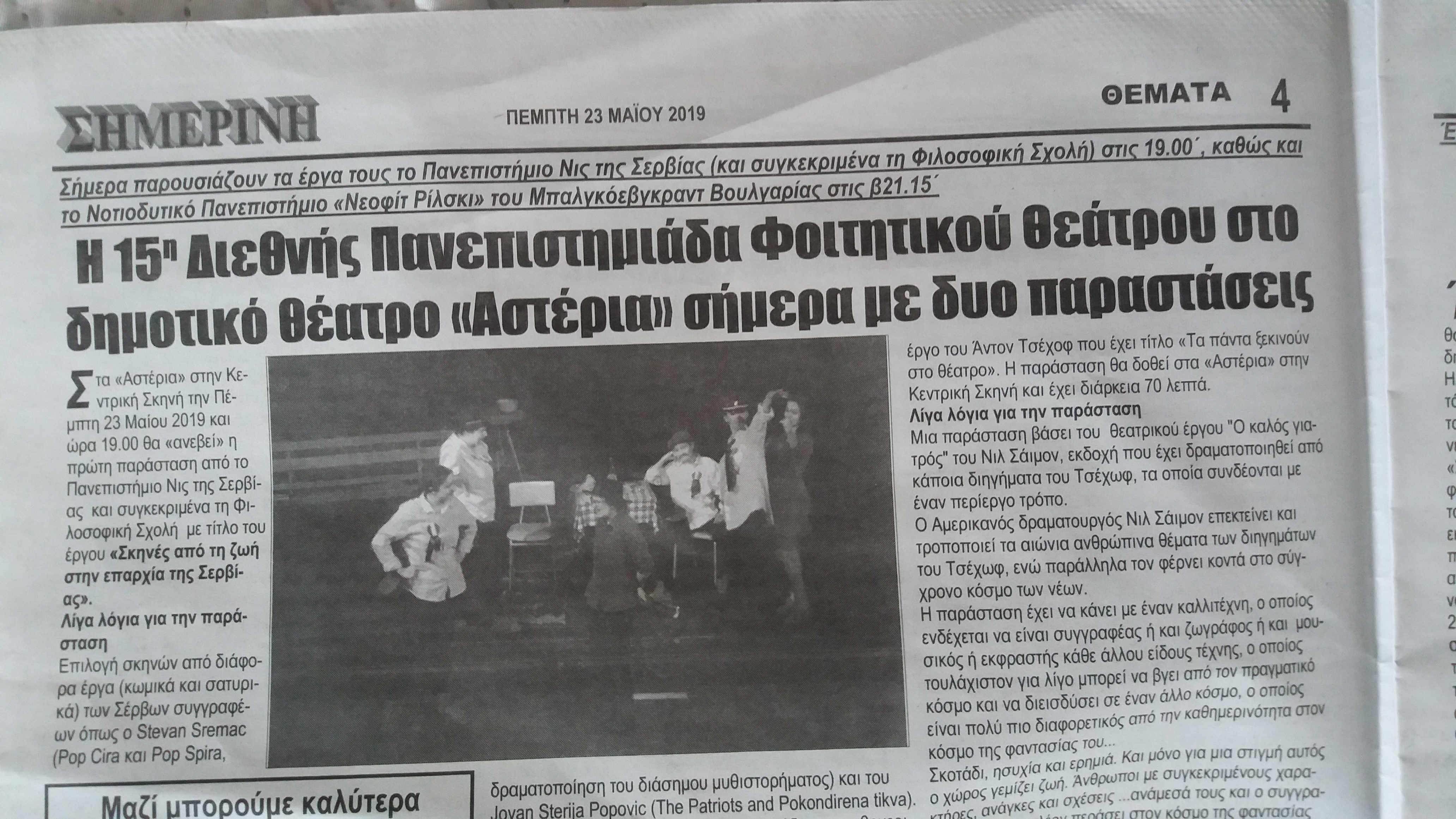 Глумачка трупа „Балканске прециозе“ са студијског програма за француски језик и књижевност отпочела је своју балканску турнеју. После успешно изведене представе Сцене из провинцијског живота у Србији, најпре у Нишу, а потом и у Лиону (Француска), наша путујућа дружина обрела се у граду Серу (Грчка) где је узела учешће на петнаестој међународној позоришној универзијади. Реч је о традиционалном фестивалу глуме на коме су прошле године учествовали наши студенти са студијског програма за србистику. Ове године фестивал је одржан од 17. до 25. маја у градском позоришту „Астерија“.