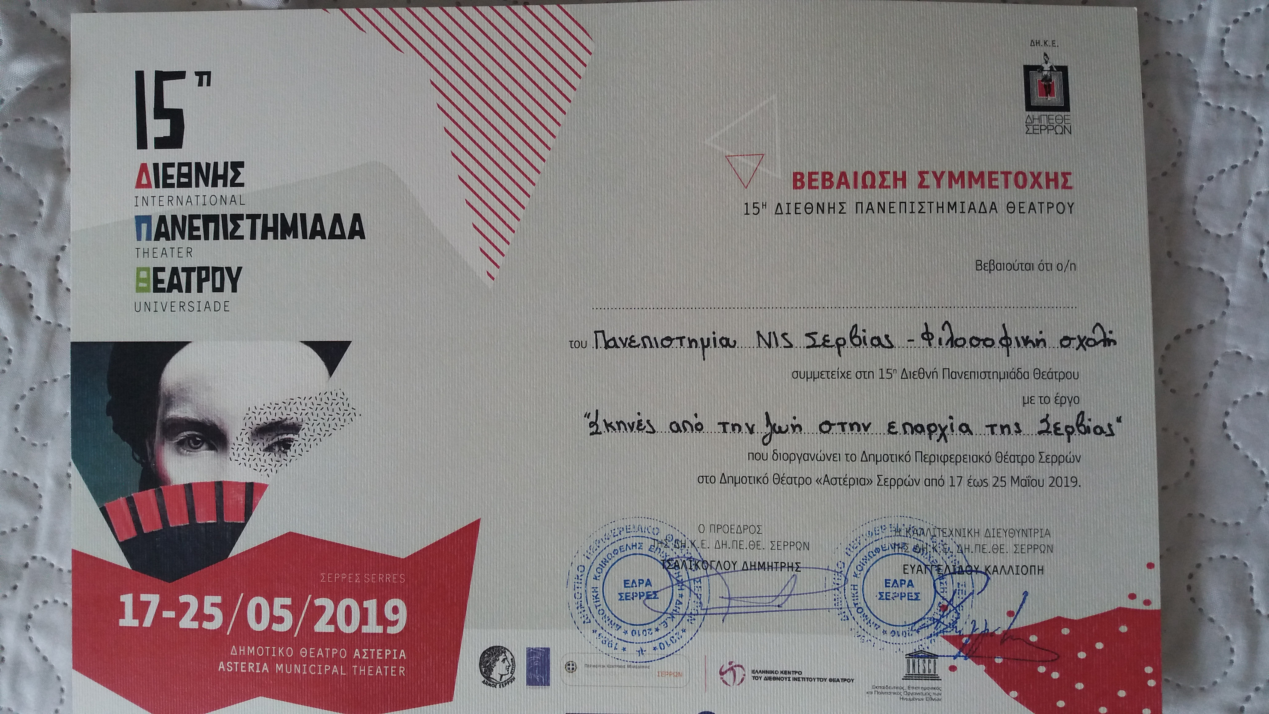Град Сер (Σέρρες) је од 2018. године побратимљен са градом Нишом, то јест потписан је Протокол о сарадњи између два града који, између осталог, подразумева научно-образовну и културно-уметничку размену. Наши студенти имали су јединствену прилику да се увере у традиционално грчко гостопримство и балкански „шмек“ људи, што је учинило да се осећају као код своје куће. Поред наших „прециоза“, на фестивалу су учествовали млади глумци из Солуна, Благоевграда (Бугарска) и других места, тако да се ова манифестација претворила у прави празник мултилингвизма и интеркултуралности. Пуни ентузијазма, с нестрпљењем се очекује гостовање у Словенији!