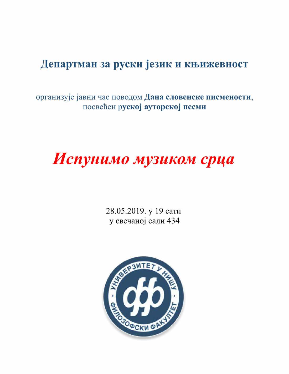 Департман за руски језик и књижевност позива вас на јавни час поводом Дана словенске писмености, посвећен руској ауторској песми. Познате песме В. Висоцког, Б. Окуџаве, Ј. Јевтушенка и Д. Давидова интерпретираће талентовани студенти Департмана за руски језик и књижевност.
