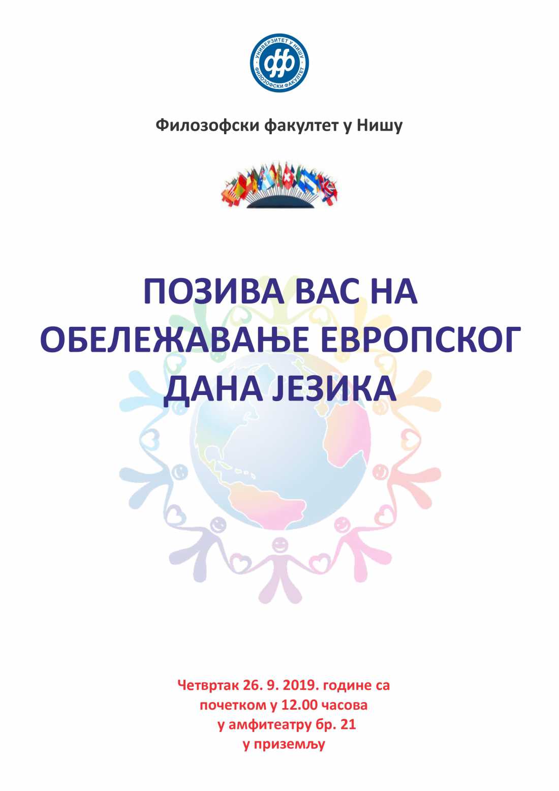 Филозофски факултет у Нишу се и ове године придружује се обележавању Европског дана језика. Тим поводом наставници и сарадници са филолошких департмана и Центра за стране језике заједно са својим студентима, и уз подршку Канцеларије за развој каријере и подршку студентима, припремили су занимљив програм на језицима који се изучавају на нашем факултету.