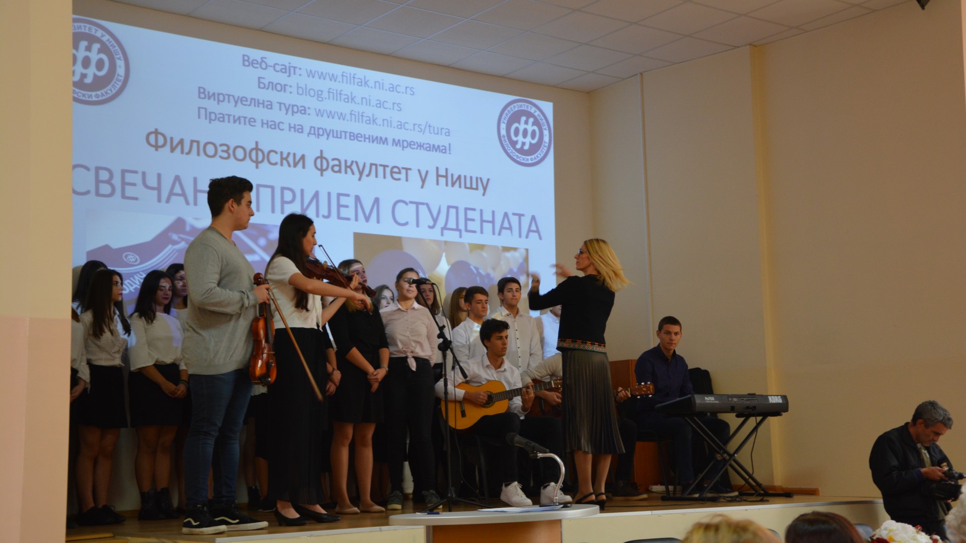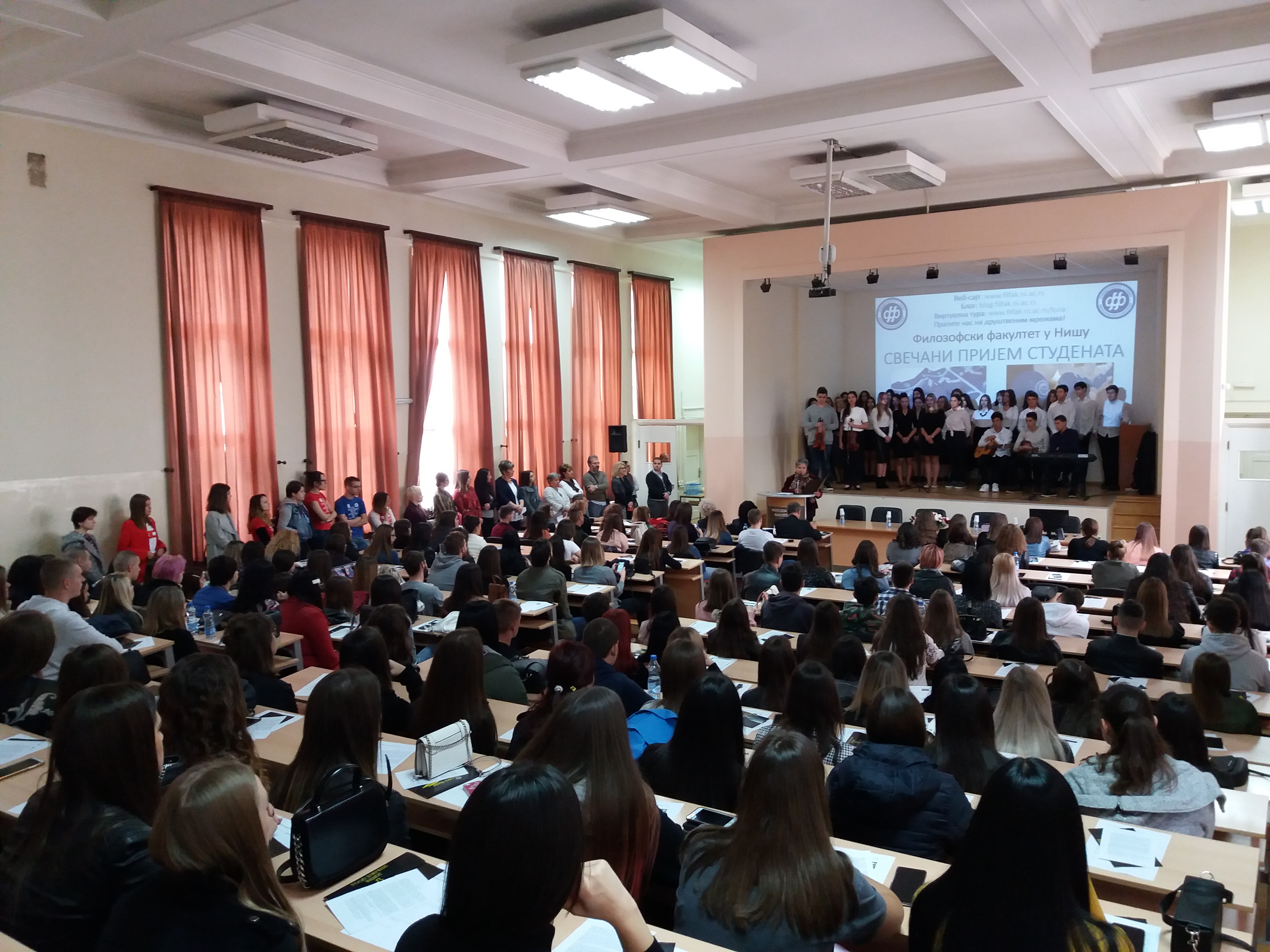 Церемонију су изабраним нумерама отворили хорови гимназија „Светозар Марковић“ и „Стеван Сремац“ након чега су новопечене студенте поздравили представници управе Факултета на челу са деканицом проф. др Наталијом Јовановић. Она је, како каже, поносна што је у доба огромне популарности ИТ сектора Филозофски факултет и даље најпопуларнија високошколска установа на Универзитету у Нишу. Такође, проф. Јовановић је захвалила студентима што су одабрали баш овај факултет, јер на тај начин доприносе очувању и унапређењу друштвено-хуманистичких наука. Традиција дуга 49 година гарантује највиши образовни и научни квалитет, па сви студенти могу бити сигурни да су направили прави избор поставши део ове престижне високошколске установе, закључује Јовановић.