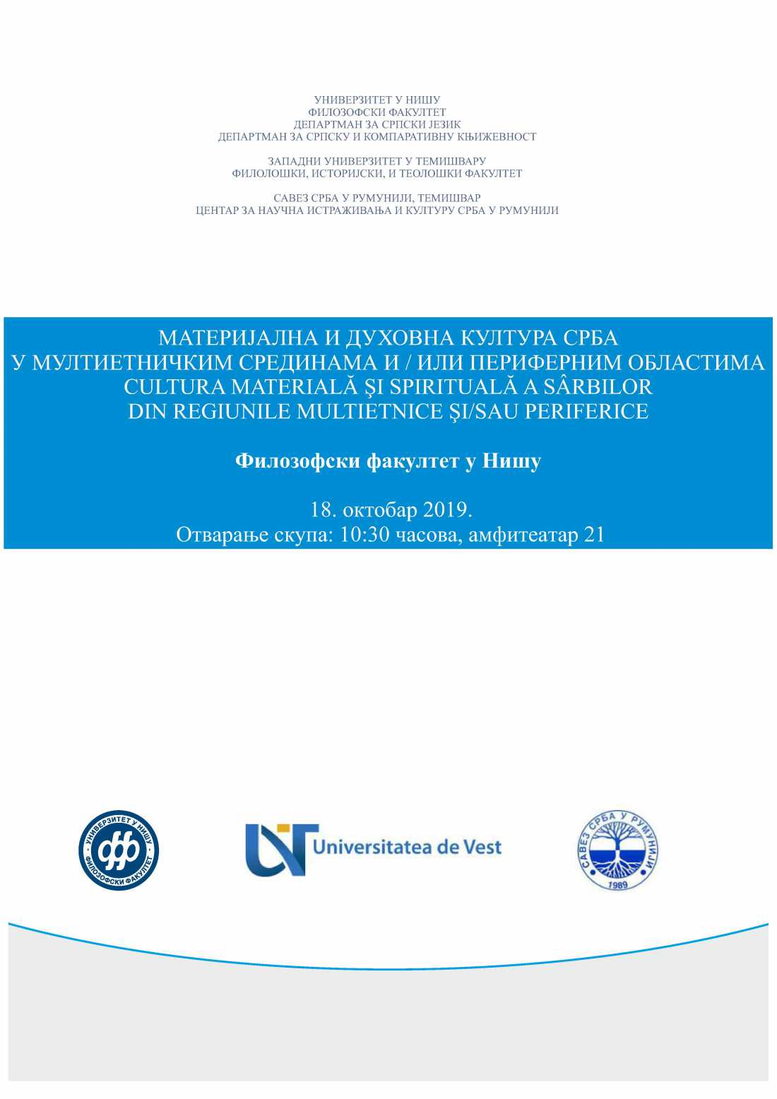 У петак, 18. 10. 2019, од 10:30h, у амфитеатру 21 одржаће се свечано отварање и пленарна предавања у оквиру шестог међународног научног скупа „Материјална и духовна култура Срба у мултиетничким срединама и / или периферним областима”. Овогодишњи међународни скуп окупио је учеснике са Западног универзитета у Темишвару, Универзитета у Букурешту, Универзитета у Београду, Универзитета у Новом Саду, Универзитета у Косовској Митровици и Универзитета у Нишу, са Института за књижевност и уметност, Етнографског института, Балканолошког института, из Православне епархије темишварске и Савеза Срба у Румунији.