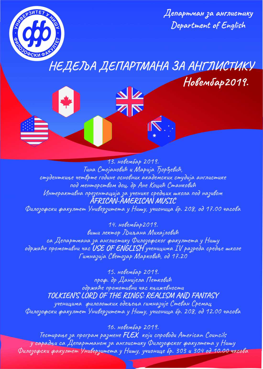 У периоду од 13. до 16. новембра 2019. године биће реализоване активности у оквиру обележавања недеље Департмана за англистику.