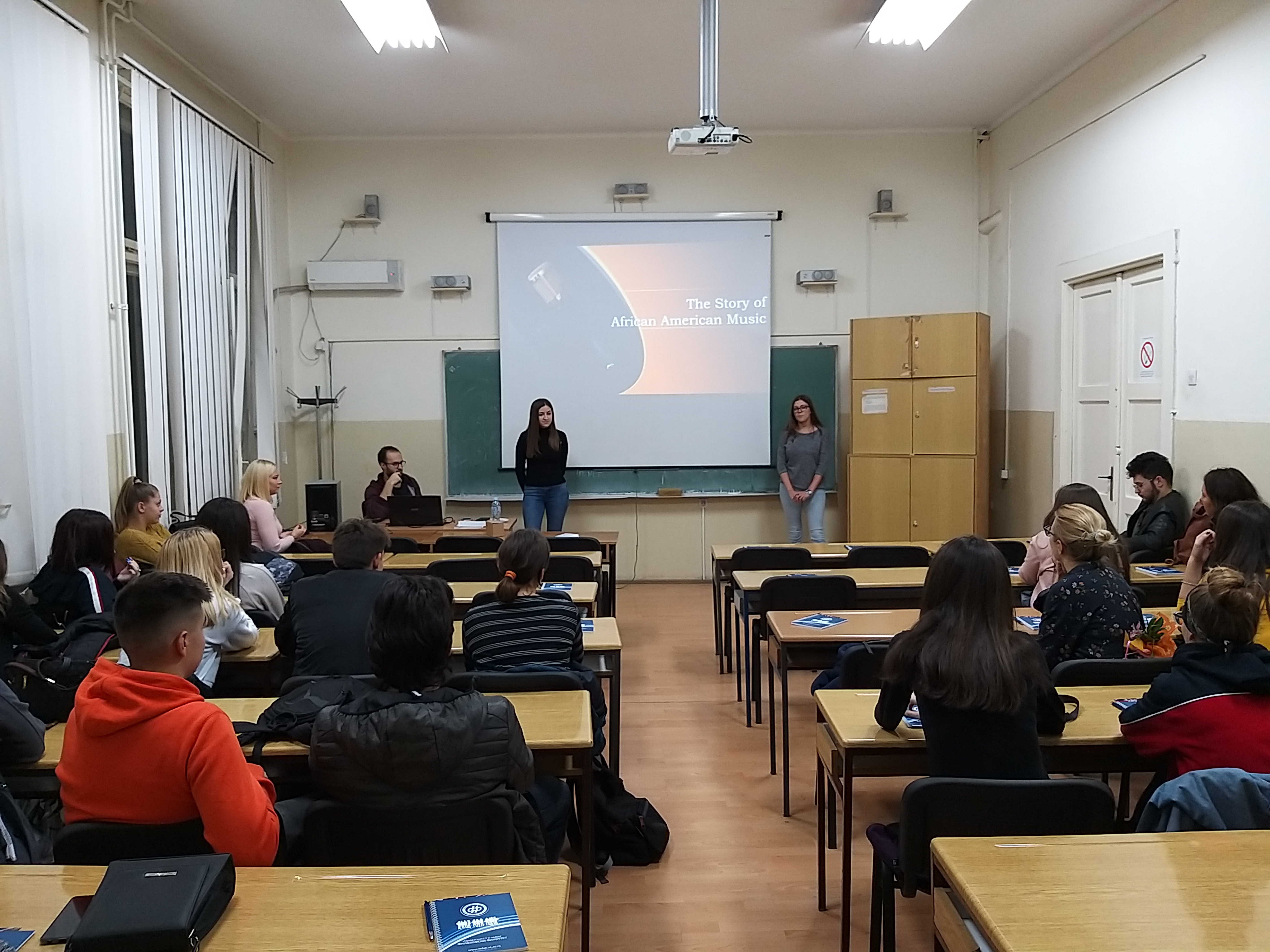 Првог дана ученици Гимназије 9. мај посетили су наш департман и имали прилике да чују интерактивну презентацију African-American Music, коју су одржале Тина Стојановић и Марија Ђорђевић, студенткиње четврте године ОАС англистике, под менторством доц. др Ане Коцић Станковић. Након дискусије у току саме презентације, средњошколци су имали прилике и да се упознају са студијским програмом, структуром пријемног испита и могућностима за даље усавршавање и запослење. Поред чланова департмана, ту су били и наши волонтери, студенти четврте године, који су са средњошколцима поделили своје утиске са студија.