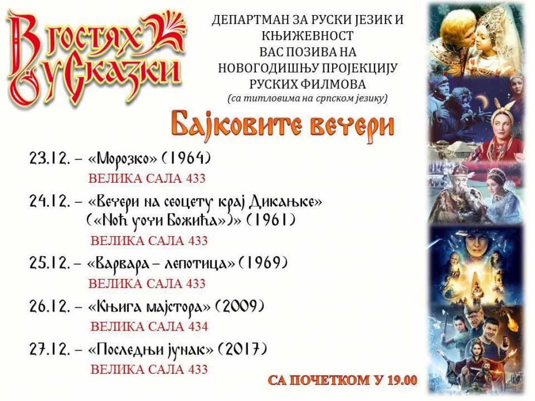 Департман за руски језик и књижевност вас позива на Бајковите вечери, на којима ће се приказивати филмови по мотивима познатих руских народних бајки, са преводом на српски језик.
