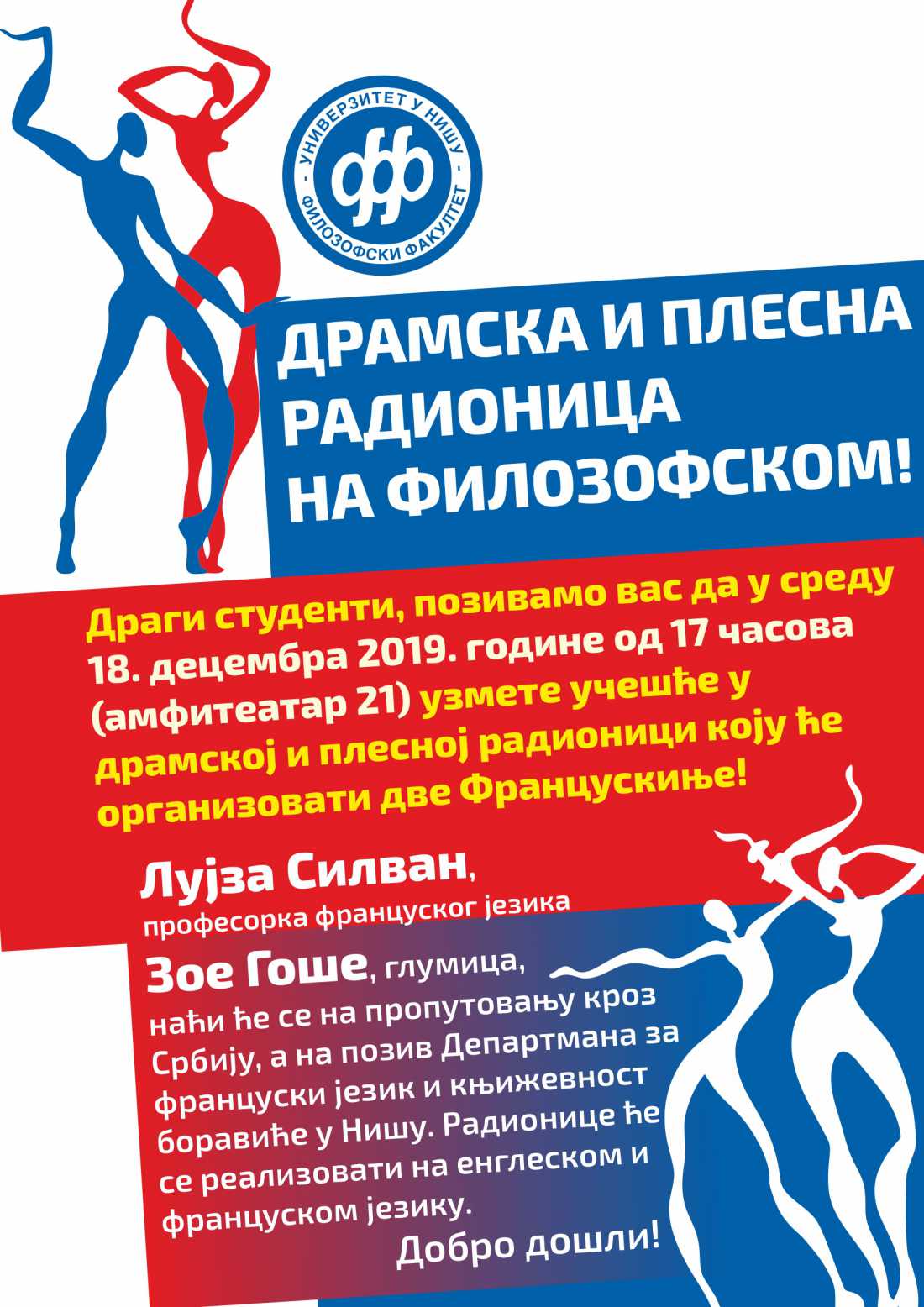 За све љубитеље француског језика и културе припремили смо драмску и плесну радионицу која ће се одржати у среду, 18. децембра с почетком у 17 сати у амфитеатру 21.