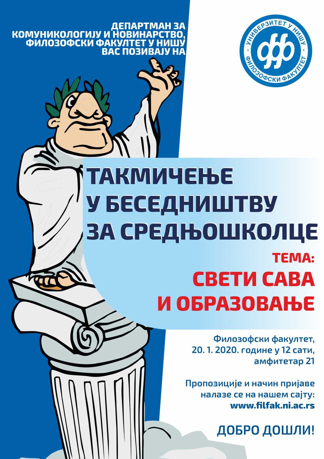 Филозофски факултет у Нишу и Департман за комуникологију и новинарство позивају средњошколце из целе земље да се пријаве на наше такмичење у беседништву на тему Свети Сава и образовање.