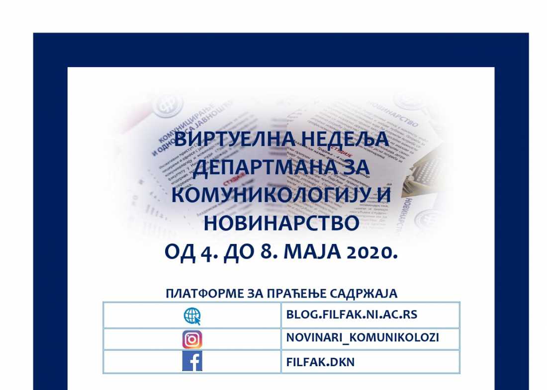 У оквиру обележавања Светског дана медијских слобода (3. мај), Департман за комуникологију и новинарство организује виртуелну недељу посвећену активностима које се реализују на студијским програмима Новинарство и Комуницирање и односи с јавношћу.