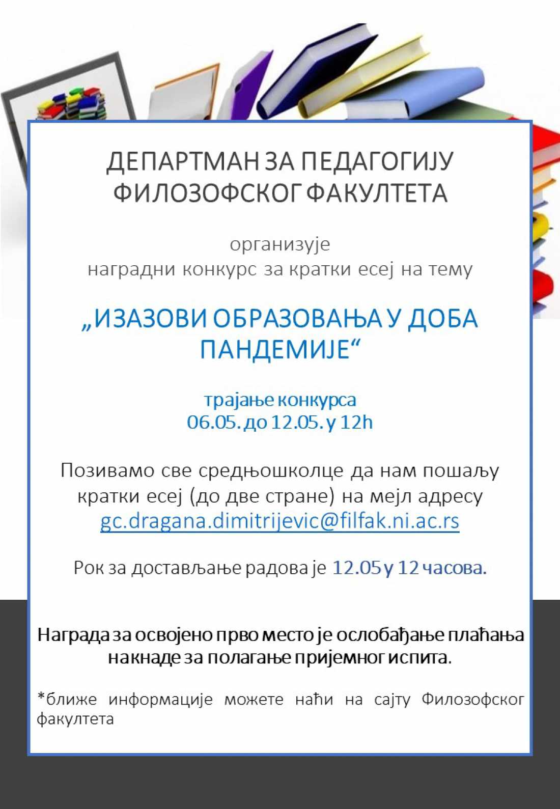 У оквиру виртуелне недеље Департмана за педагогију организован је наградни конкурс за кратак есеј на  тему Изазови образовања у доба пандемије.  Током трајања конкурса (06.05.-12.05)  пристигло је чак 16  ученичких радова.
