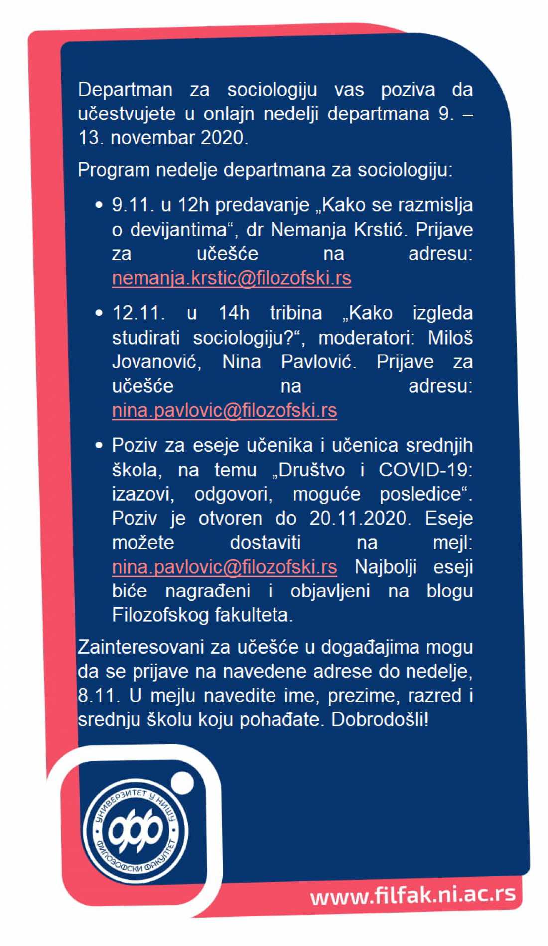 Департман за социологију вас позива да учествујете у онлајн недељи департмана која ће се одржати од 9 до 13. новембра. Позив је, пре свега, упућен средњошколцима, али могу се пријавити сви који су заинтересовани за наведене теме
