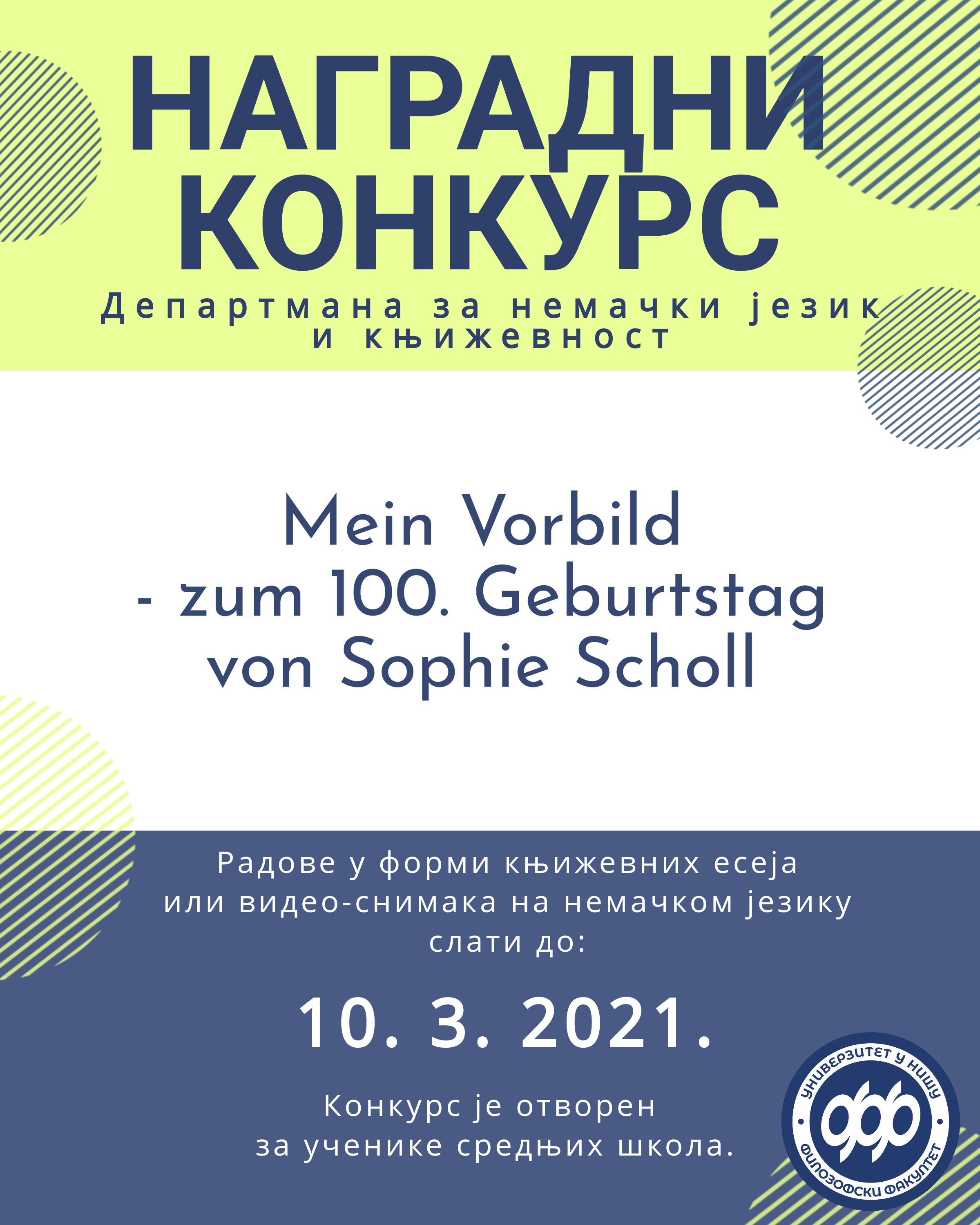 Понедељак, 15. 3. 2021. године – објављивање резултата наградног књижевног и видео конкурса Mein Vorbild – zum 100. Geburtstag von Sophie Scholl (Филоблог и друштвене мреже)