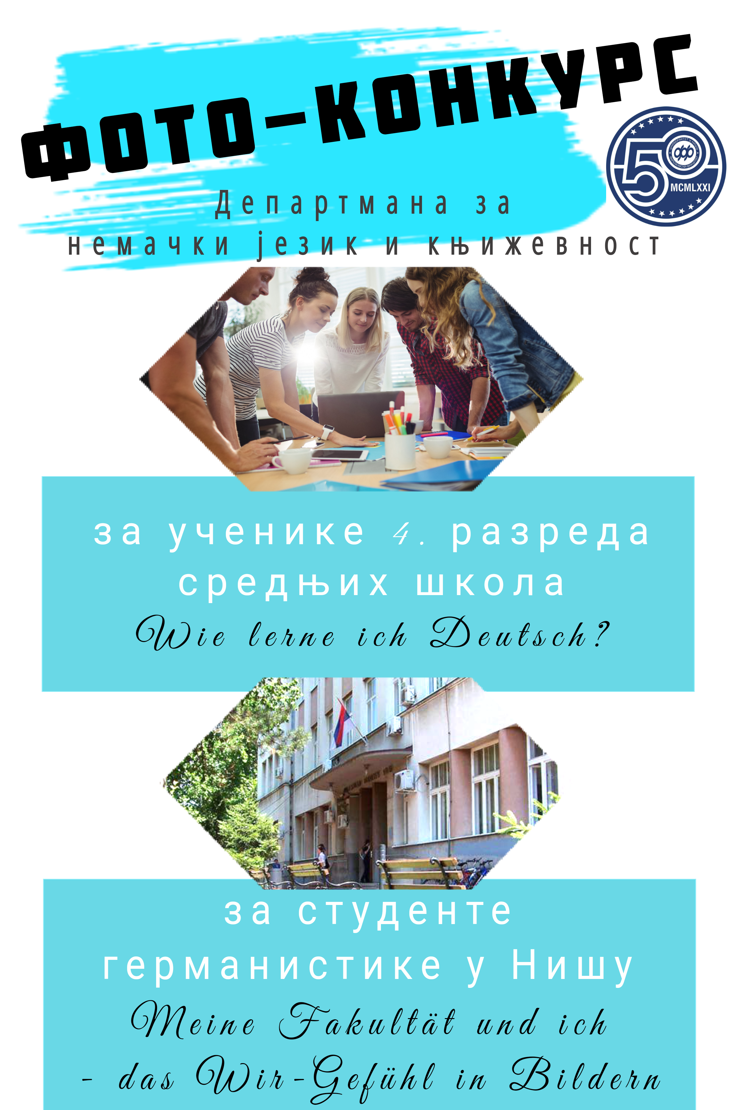 Моћи ћете да погледате радове пристигле на фото-конкурс (1) за ученике 4. разреда средњих школа у Србији на тему Wie lerne ich Deutsch и (2) за студенте германистике Филозофског факултета у Нишу на тему Meine Fakultät und ich – das Wir-Gefühl in Bildern. Ученици ће приказати кроз фото-репортажу уз пропратни текст на немачком језику индивидуалне стилове учења језика, а студенти академски дух заједништва и свој доживљај Филозофског факултета у години јубилеја. Пропозиције се налазе у прилогу, а сва питања и пријаве упутити на: .