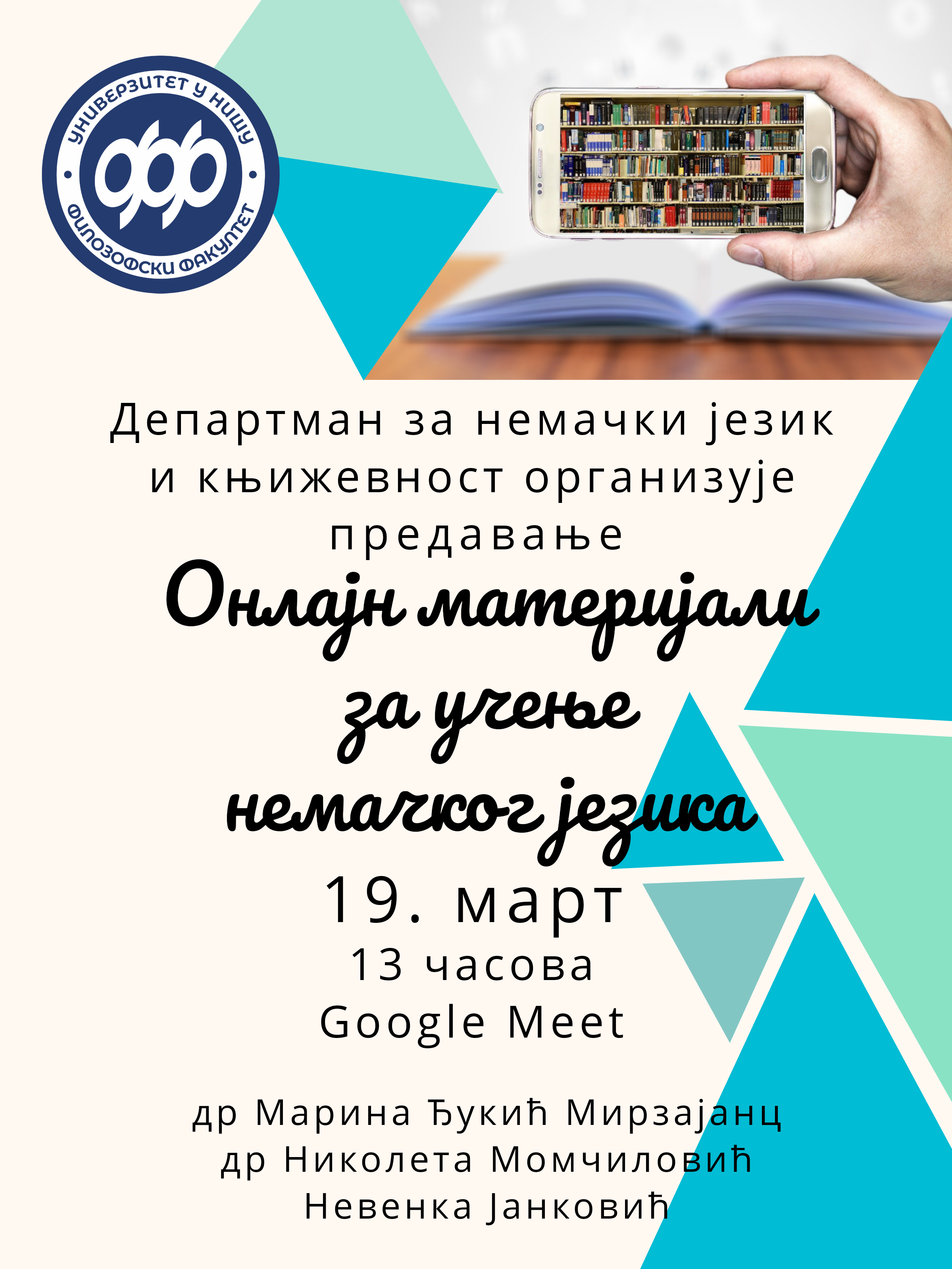 Петак, 19. 3. 2021. год. у 13 часова – предавање Употреба онлајн материјала за учење немачког језика (Google Meet)