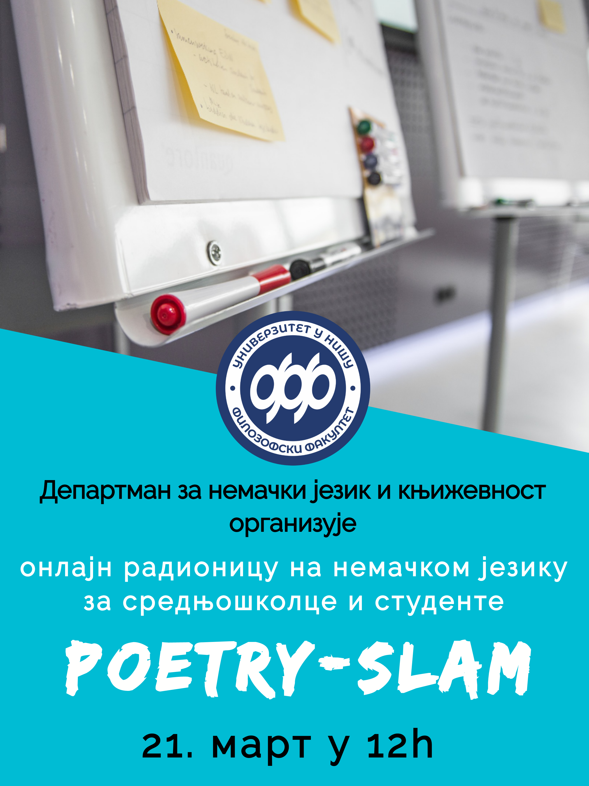 На Светски дан поезије укључите се у онлајн радионицу у оквиру које ће се обрадити шта је то Slam Poetry и како написати самостално краћу песму на немачком језику. На крају радионице биће уприличено мини-такмичење у извођењу песама које су саставили средњошколци и студенти, а најбоља (према гласовима публике) добиће симболичну награду. Радионицу воде сараднице на Департману Невенка Јанковић и Бранка Огњановић. Пријаве слати на: .