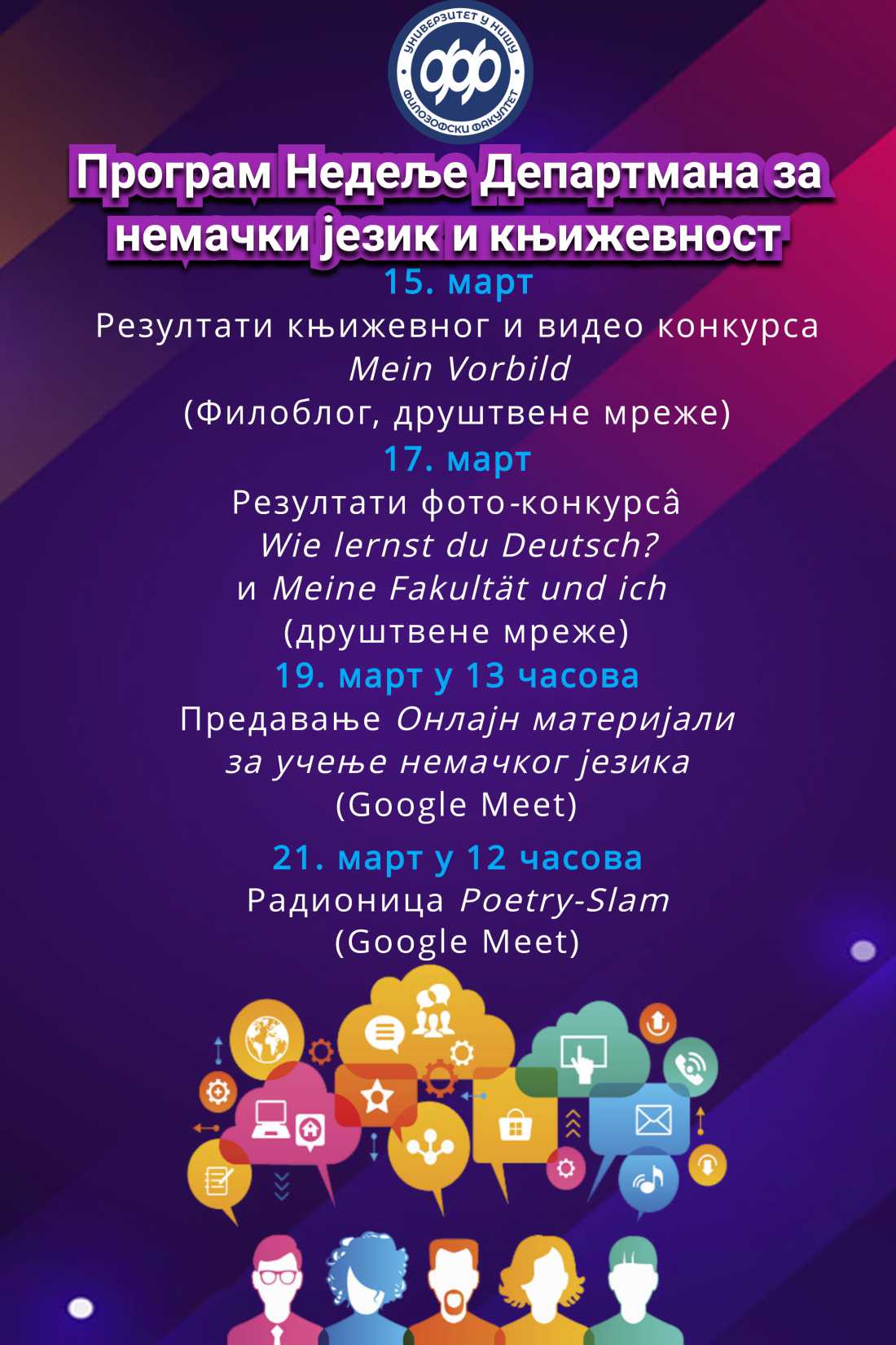 Департман за немачки језик и књижевност организује у периоду од 15. до 21. марта 2021. године Недељу Департмана, која ће се реализовати виртуелним путем. Позивамо вас да нам се придружите у активностима и да се ближе упознате с немачким језиком и културом, а уједно и с најмлађим департманом на Филозофском факултету у Нишу.