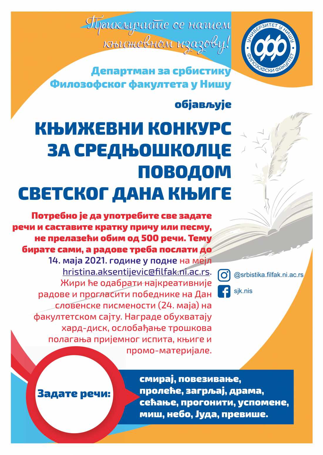 Поводом Светског дана књиге, Департман за србистику Филозофског факултета у Нишу упућује изазов свим средњошколцима. Потребно је да употребите свe речи које су за вас бирали професори нашег департмана и саставите кратку причу или песму. Тему бирате сами, а битно је да ваше уметничко дело не прелази обим од 500 речи и да се у њему налазе следеће речи у било ком облику: смирај, повезивање, пролеће, загрљај, драма, сећање, прогонити, успомене, миш, небо, Јуда, превише. Најкреативније радове који стигну до 14. маја 2021. године у подне на мејл  одабраће стручни жири. Победнике ћемо прогласити на Дан словенске писмености (24. маја) на факултетском сајту и наградити дипломама и вредним наградама. Победничке кратке књижевне форме биће објављене на Филоблогу, блогу Филозофског факултета у Нишу.