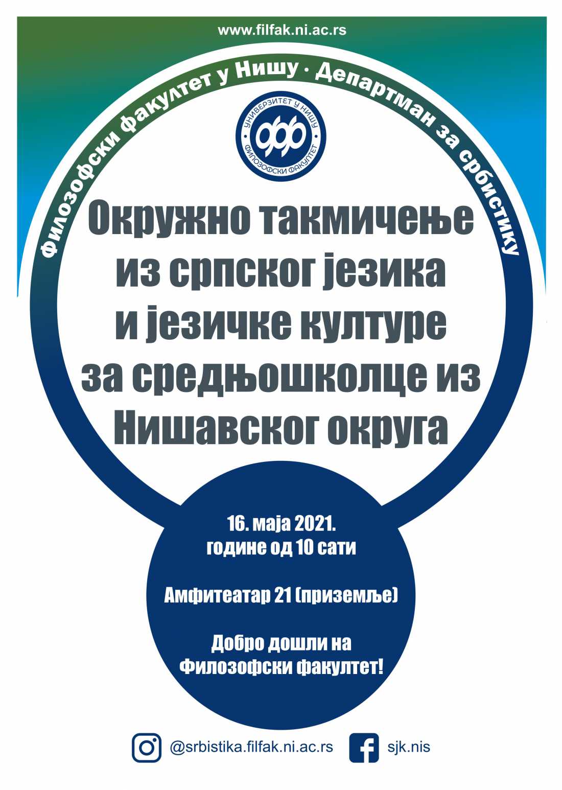 Филозофски факултет у Нишу био је 16. маја 2021. године домаћин Окружног такмичења из српског језика и језичке културе за средњошколце из Нишавског округа. Прелиминарне ранг-листе налазе се у прилогу.