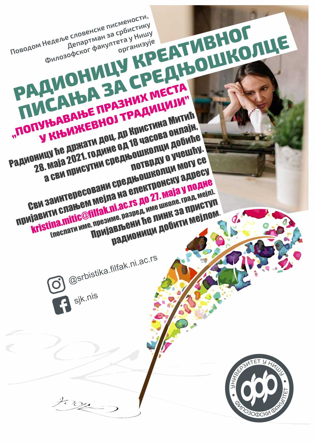 Поводом Недеље словенске писмености, Департман за србистику Филозофског факултета у Нишу организује радионицу креативног писања за средњошколце „Попуњавање празних места у књижевној традицији”. Радионицу ће држати доц. др Кристина Митић 28. маја 2021. године од 18 часова онлајн, а сви присутни средњошколци добиће потврду о учешћу. Сви заинтересовани средњошколци могу се пријавити слањем мејла на електронску адресу до 27. маја у подне (послати име, презиме, разред, име школе, град, мејл). Пријављени ће линк за приступ радионици добити мејлом.