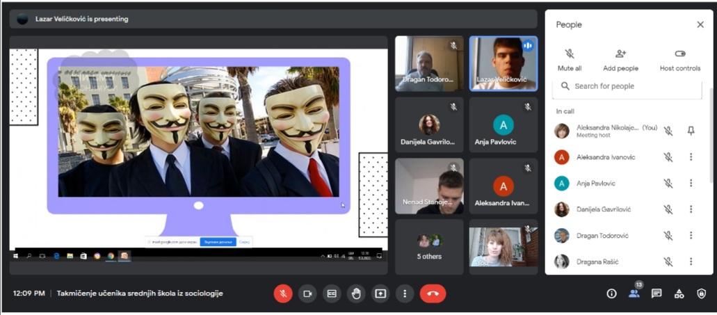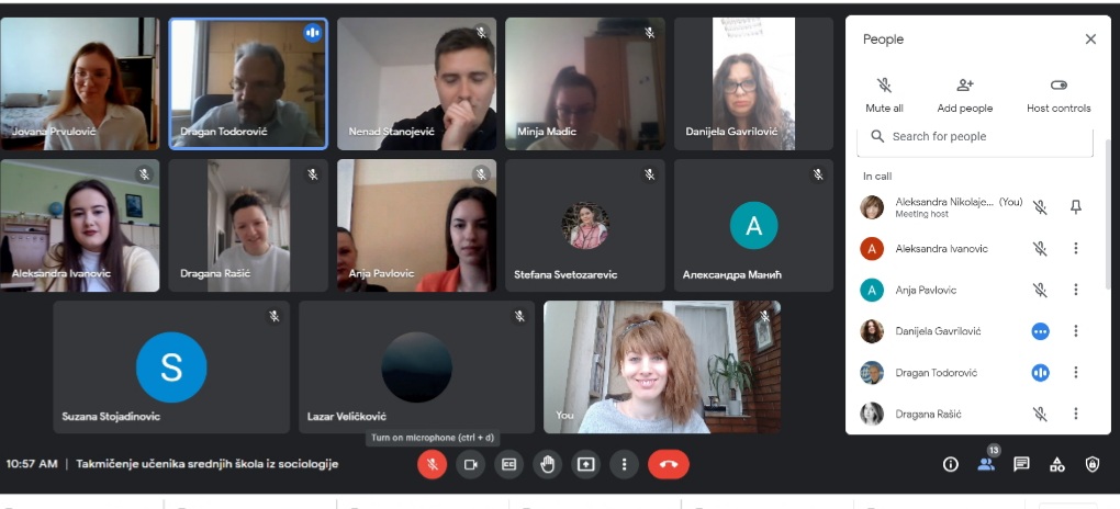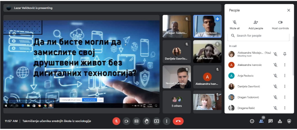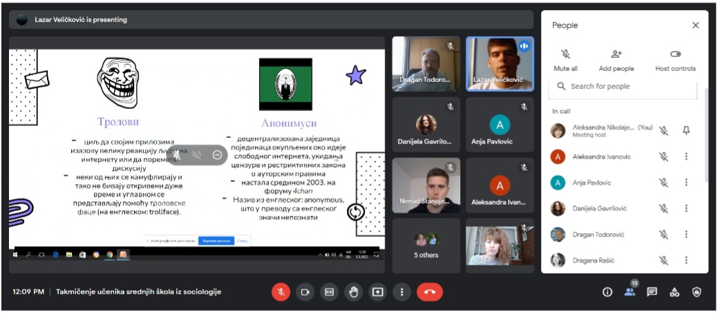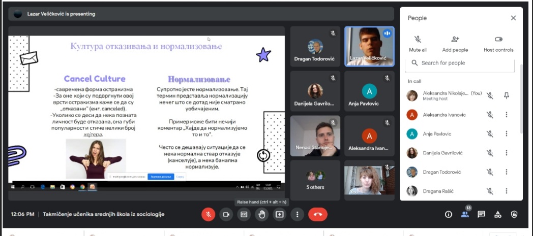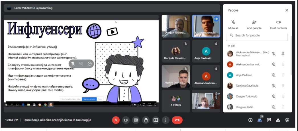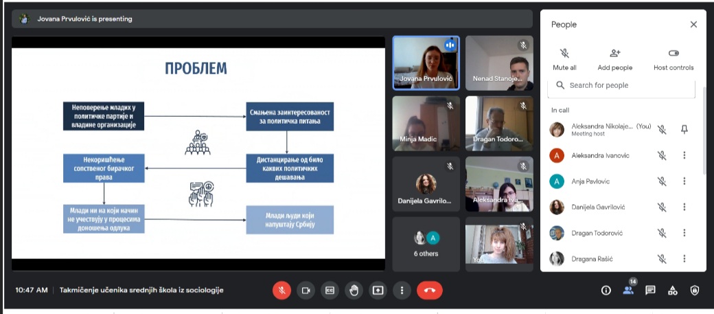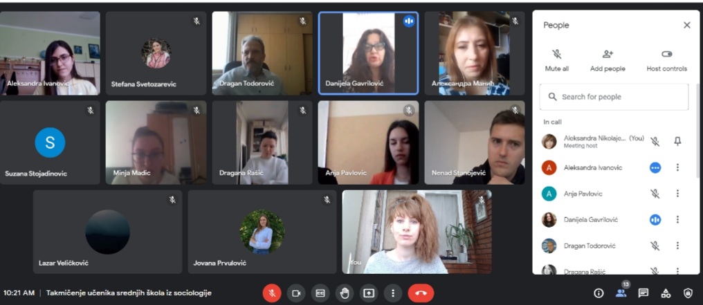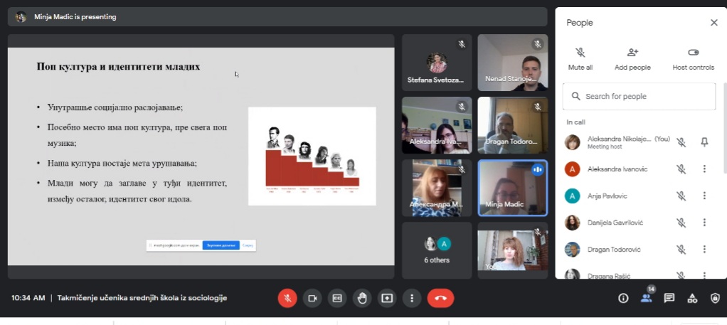 За овогодишње регионално такмичење ученика средњих школа из социологије на тему "ГРУПНИ ИДЕНТИТЕТИ МЛАДИХ" у Нишу пристигло је преко 50 такмичарских радова. Одбрана ученичких радова одржана је у суботу, 5. марта 2022. године преко google meet апликације где је 7 ученика и ученица имало прилику да бране своје радове. О радовима је одлучивала стручна комисија у следећем саставу: