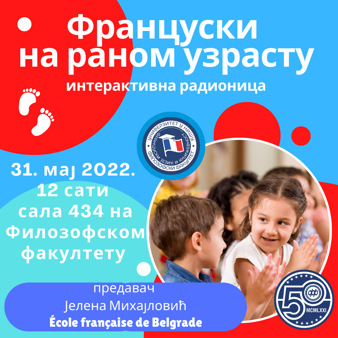 На велику радост и задовољство Департмана за француски језик и књижевност најављујемо радионицу о учењу француског језика на раном узрасту! Ову интерактивну радионицу посвећену раду са децом узраста од три до шест година и подељену у две сесије, од 12 до 13.30 сати и од 13.45 до 15.15 сати водиће Јелена Михајловић, предавач у Француској школи у Београду (École française de Belgrade) са дугогодишњем искуством, нарочито у раду са децом од две и по до дванаест година. Јелена Михајловић је у Паризу предавала француски као страни језик, а била је ангажована и као виши лектор за српски језик на Сорбони (Sorbonne Université). Осим тога, радила је као координатор преводилачких радионица на Универзитету у Поатјеу (Université de Poitiers).