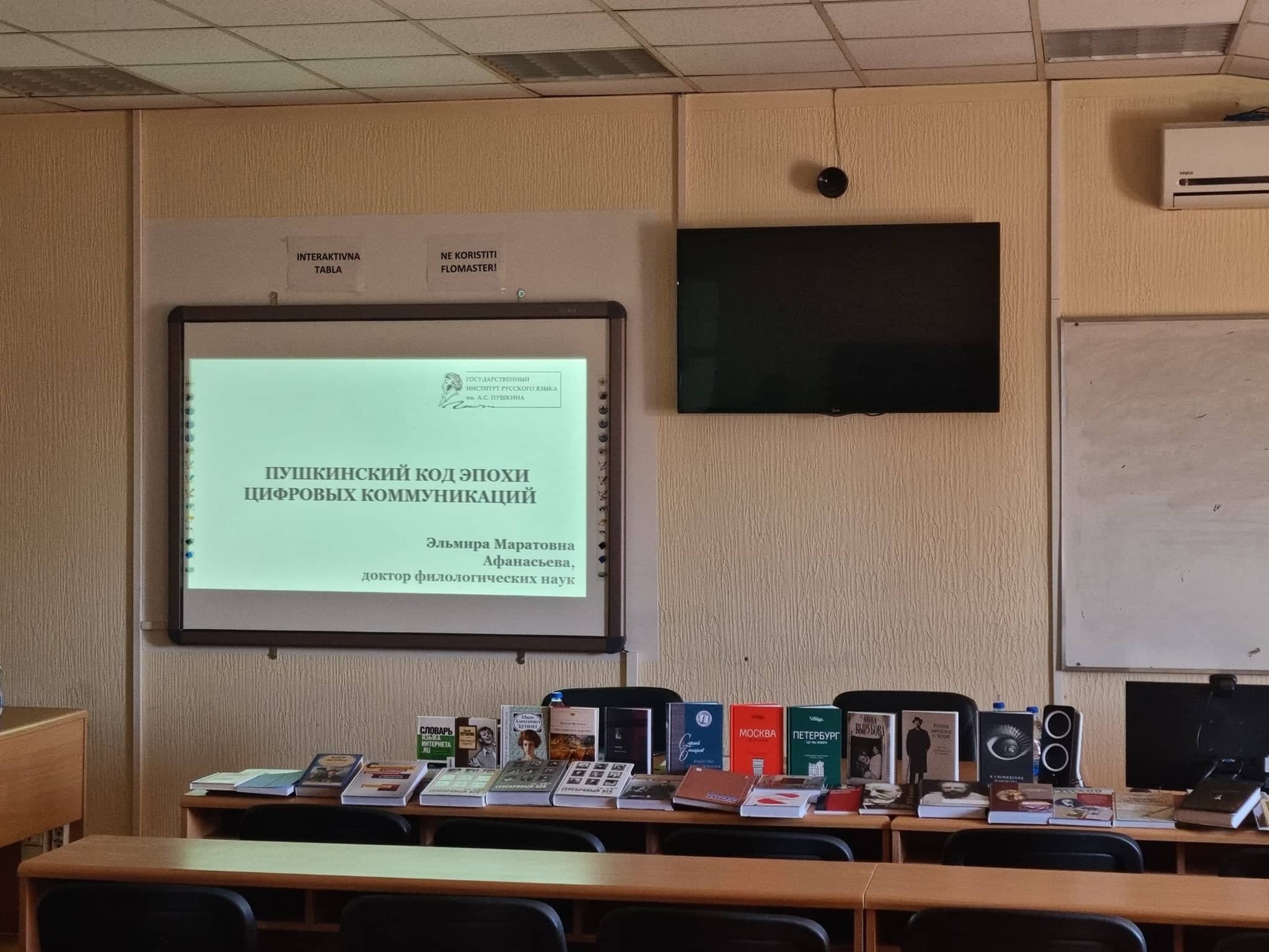 Промоција књижевних издања и културне делатности Дома руске емиграције „А. И. Солжењицина“, уручење вредног поклона факултету и предавање проф. др Елмире Афанасјеве са Института руског језика „А. С. Пушкин“ одржано је 30.5.2022. год. у присуству великог броја студената, чланова мреже наставника руског језика и гостију из Руског дома и Амбасаде Руске Федерације. Сарадница Дома руске емиграције „А. И. Солжењицин“, Татјана Иринархова, уручила је факултету око 300 вредних издања из руске књижевности, као и методичких приручника и уџбеника руског језика за разне нивое учења. Захваливши се на овом поклону, управник Департмана за руски језик и књижевност проф. др Велимир Илић најавио је отварање Центра за наставна средста, у чијем ће се фонду, поред ових нових издања, наћи још једна донација књига и уџбеника Фондације „Руски мир“, уз чију подршку ће се овај центар и основати. Отварање Центра планирано је до краја ове године, а осим студената потребне књиге моћи ће да позајмљују и настаници руског језика основних и средњих школа.