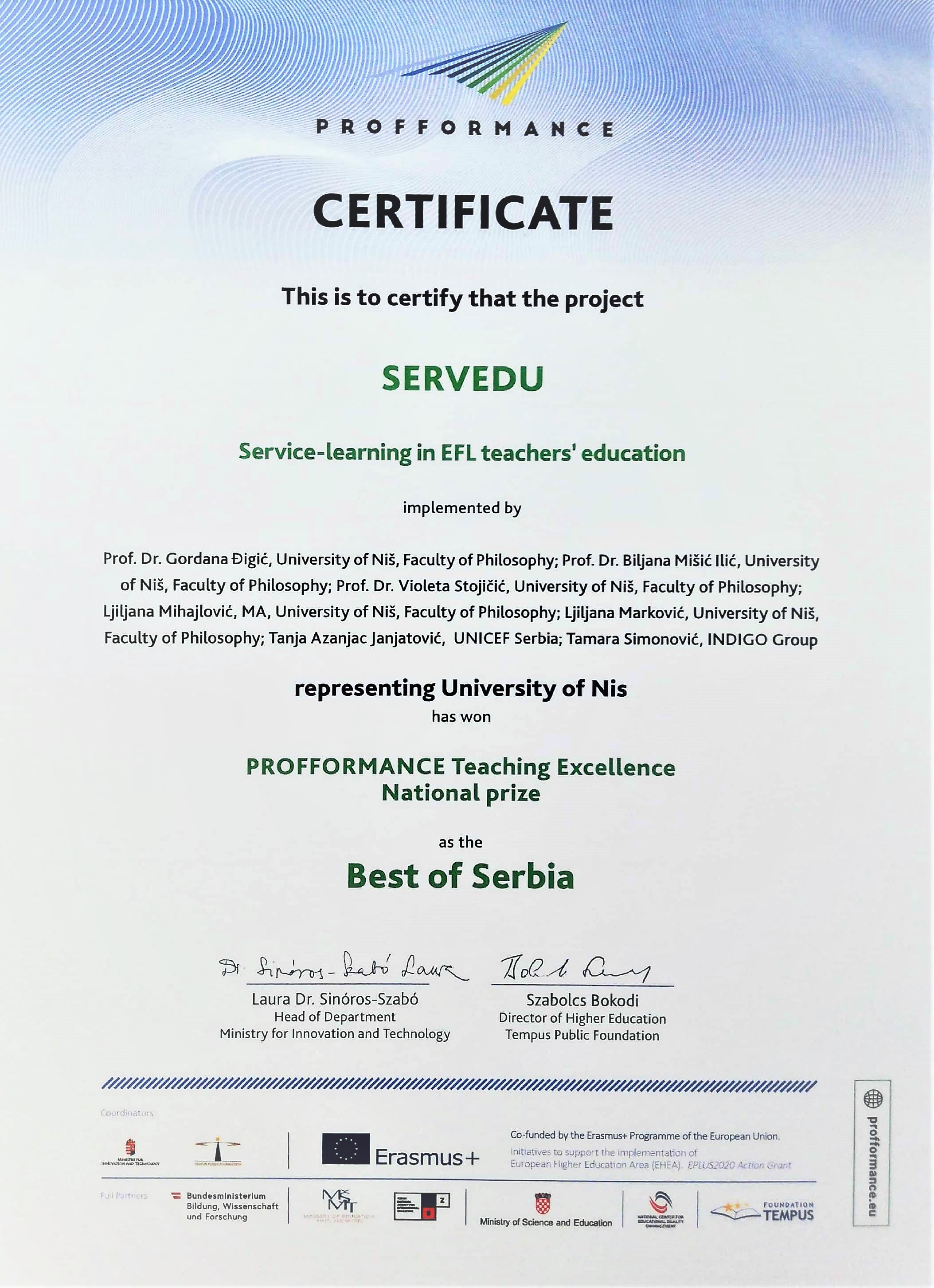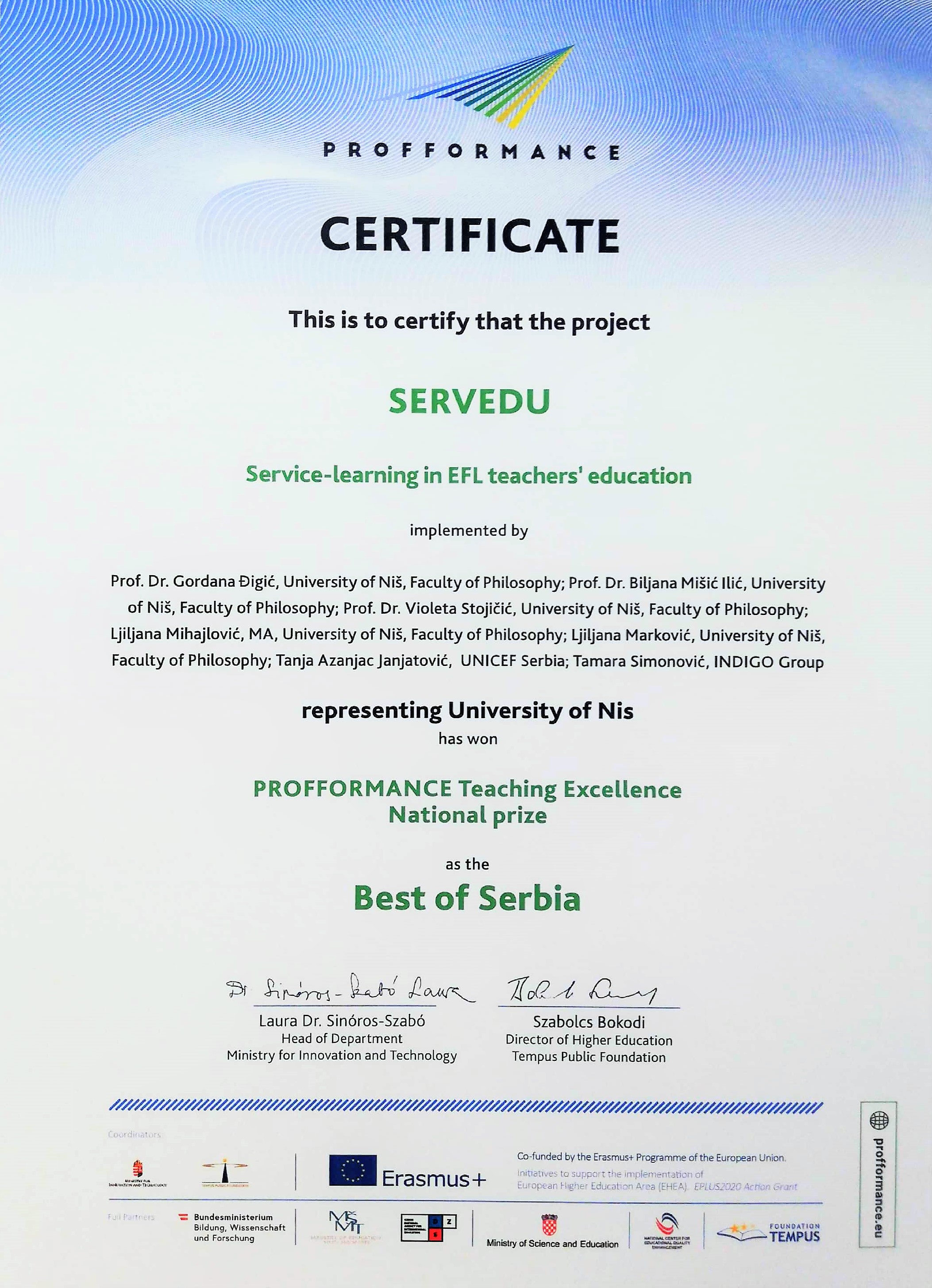 Тим који се састоји од студената и наставника Филозофског факултета у Нишу и представника партнерских организација УНИЦЕФ Србија и Група за децу и младе „Индиго“ добитник је међународне награде PROFFORMANCE International Higher Education Teacher Award у категорији Impact and mission with and for society и PROFFORMANCE Best of Serbia. Наши представници добили су награду за укључивање елемената учења кроз друштвено-користан рад у неколико изборних предмета на четвртој години студија англистике. Наиме, студенти су у склопу редовних активности на овим предметима могли да држе онлајн курсеве енглеског језика за децу мигранте у прихватним центрима у Србији, чиме су стекли значајно практично искуство у држању наставе енглеског језика али се и практично ангажовали у решавању једног друштвеног проблема – пружању подршке образовању ученика избеглица и миграната у Србији.
